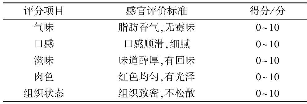 评分项目感官评价标准得分/分气味脂肪香气,无霉味0^10口感口感顺滑,细腻0^10滋味味道醇厚,有回味0^10肉色红色均匀,有光泽0^10组织状态组织致密,不松散0^10