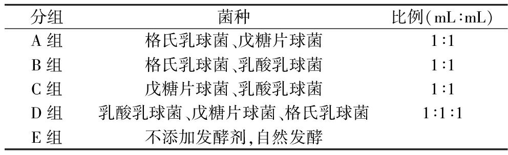 分组菌种比例(mL∶mL)A组格氏乳球菌、戊糖片球菌1∶1B组格氏乳球菌、乳酸乳球菌1∶1C组戊糖片球菌、乳酸乳球菌1∶1D组乳酸乳球菌、戊糖片球菌、格氏乳球菌1∶1∶1E组不添加发酵剂,自然发酵