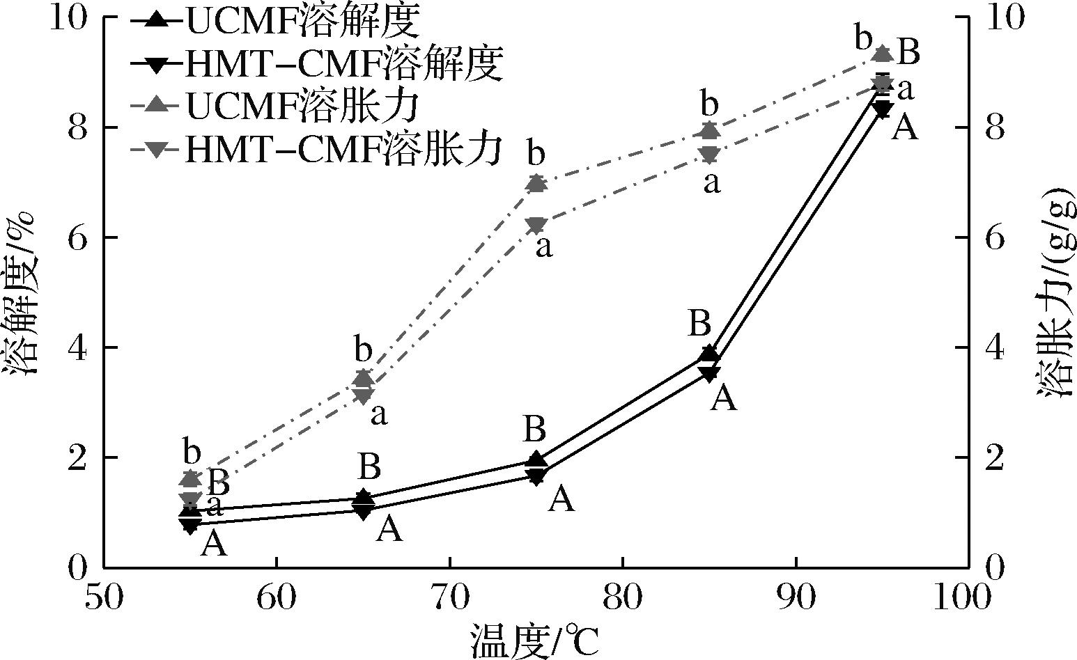注:不同大写字母、小写字母分别表示同一温度不同样品的溶解度和溶胀力之间差异显著(P<0.05)。