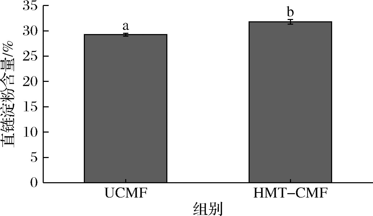 控制水分含量为26%,在117 ℃下对CMF湿热处理4.3 h,由图2可知,湿热处理使CMF中直链淀粉含量显著增加(P<0.05),相较于未处理的增加了8.65%,其原因可能是热能和水分协同作用打断支链侧链,从而产生较多的短直链分子。湿热处理过程中的高温可能会破坏支链淀粉最外层的线性链,导致形成类似于直链淀粉的短链,并可能与体系中的其他直链淀粉络合,从而增加直链淀粉含量。一般而言,直链淀粉含量的增加与淀粉抗消化性能的提升呈正相关[13]。上述结果表明,湿热处理在一定程度上能够增强直链淀粉的含量,从而提高CMF的抗消化性。