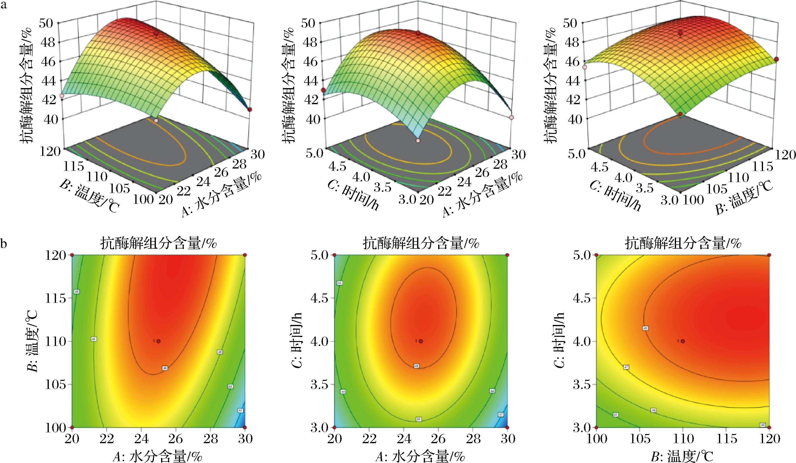 对表5实验结果进行二次多项回归拟合,得到多元回归方程如下:Y=48.49+0.086A+1.03B+0.96C+1.66AB+0.71AC+0.025BC-4.35A2-0.72B2-1.85C2。回归模型方差分析结果见表6。回归模型具有极高的统计学显著性(P<0.000 1),表明该模型整体拟合良好,失拟项检验结果不显著(P=0.219 6),说明该模型具有统计学意义。由方差分析可知,R2和接近1,C.V.%远小于10,表明实验的离散程度较低,该模型的置信度高。由显著性检验可知,湿热处理温度和时间对处理后CMF中抗酶解组分含量有极显著影响(P<0.01),在水分含量为20%~30%之间时,湿热处理对CMF中抗酶解组分含量影响不显著(P>0.05)。根据回归模型绘制的三维响应面图和等高线图见图1。
