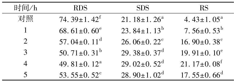 由表4可知,随着湿热处理时间的增加,RDS含量呈先降后增的趋势,SDS和RS含量呈先增后降的趋势,在处理时间3、4、5 h时SDS含量达到最高且无显著差异(P>0.05),处理时间为4 h时RDS含量显著低于其他处理组(P<0.05),为49.81%,RS含量在该处理条件下显著提升(P<0.05),达到21.17%,表明延长湿热处理时间可能会可促进淀粉分子重排,形成更有序的结构,进而提高其抗消化性[11]。
