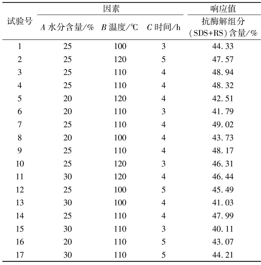根据Box-Behnken中心组合设计原理,以抗酶解组分(SDS+RS)含量为响应值,采用三因素三水平的响应面设计方法,如表1所示。