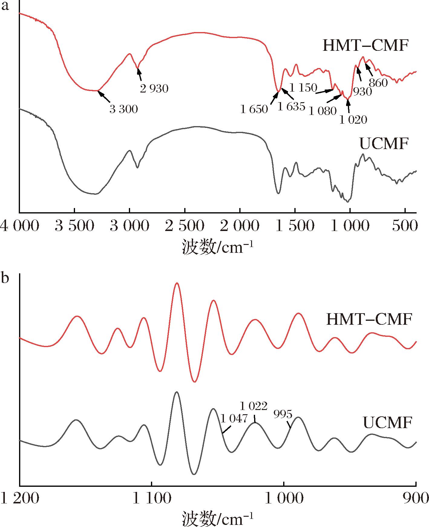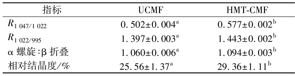 指标UCMFHMT-CMFR1 047/1 0220.502±0.004a0.577±0.002bR1 022/9951.397±0.003a1.443±0.002bα螺旋∶β折叠1.060±0.006a1.094±0.003b相对结晶度/%25.56±1.37a 29.36±1.11b
