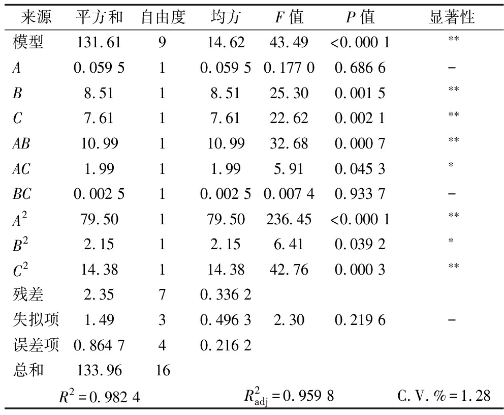 来源平方和自由度均方F值P值显著性模型131.61914.6243.49<0.000 1∗∗A0.059 510.059 50.177 00.686 6-B8.5118.5125.300.001 5∗∗C7.6117.6122.620.002 1∗∗AB10.99110.9932.680.000 7∗∗AC1.9911.995.910.045 3∗BC0.002 510.002 50.007 40.933 7-A279.50179.50236.45<0.000 1∗∗B22.1512.156.410.039 2∗C214.38114.3842.760.000 3∗∗残差2.3570.336 2失拟项1.4930.496 32.300.219 6-误差项0.864 740.216 2总和133.9616R2=0.982 4R2adj=0.959 8C.V.%=1.28