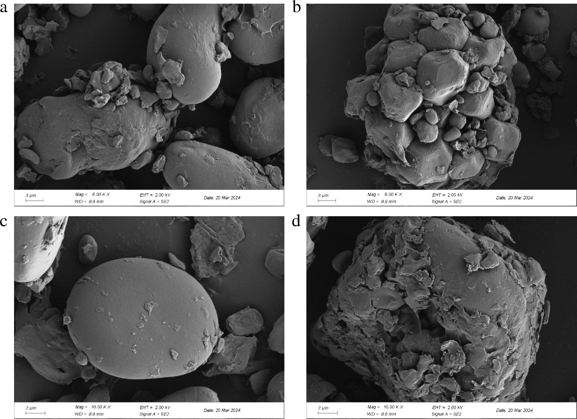 图6为CMF颗粒的扫描电镜图。CMF颗粒表面较光滑,无规则形态,经湿热处理后仍能观察到完整的颗粒结构,但颗粒出现相互聚集现象,颗粒间连接紧密,形成团聚体,说明淀粉颗粒的比表面积减小,与酶的接触位点减少,提示湿热处理后CMF不易被淀粉酶消化水解,这与王伟良等[32]的研究结果一致。