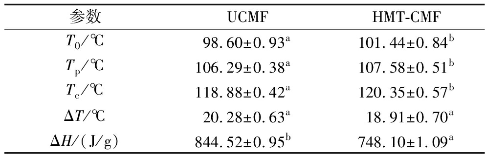 参数UCMFHMT-CMFT0/℃98.60±0.93a101.44±0.84bTp/℃106.29±0.38a107.58±0.51bTc/℃118.88±0.42a120.35±0.57bΔT/℃20.28±0.63a18.91±0.70aΔH/(J/g)844.52±0.95b748.10±1.09a