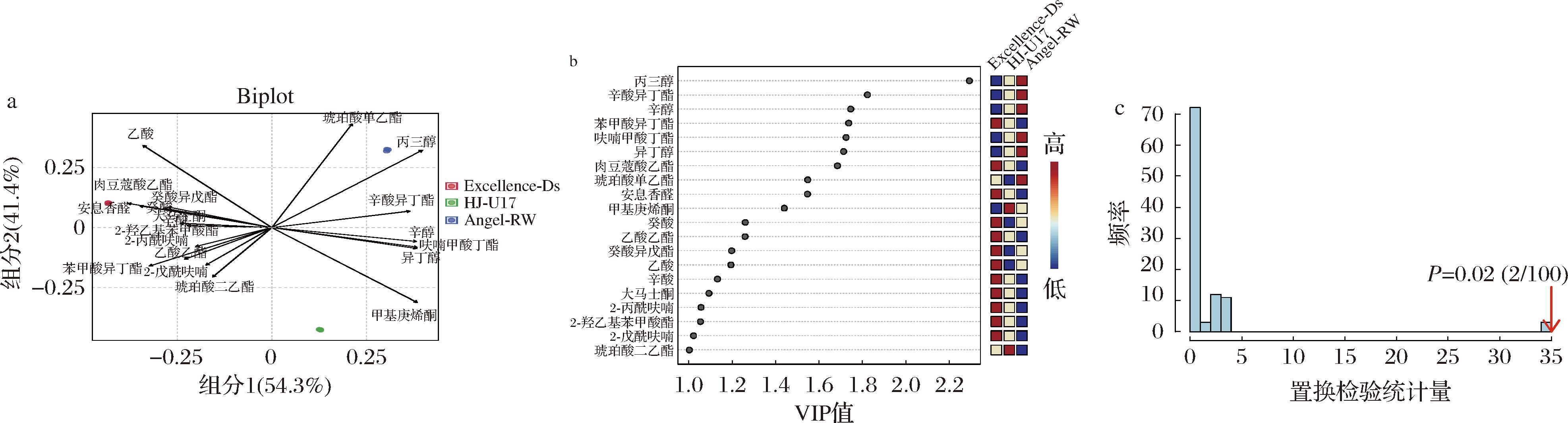 a-ROAV≥0.1挥发性香气成分PLS-DA两点图;b-VIP值图;c-置换检验结果图