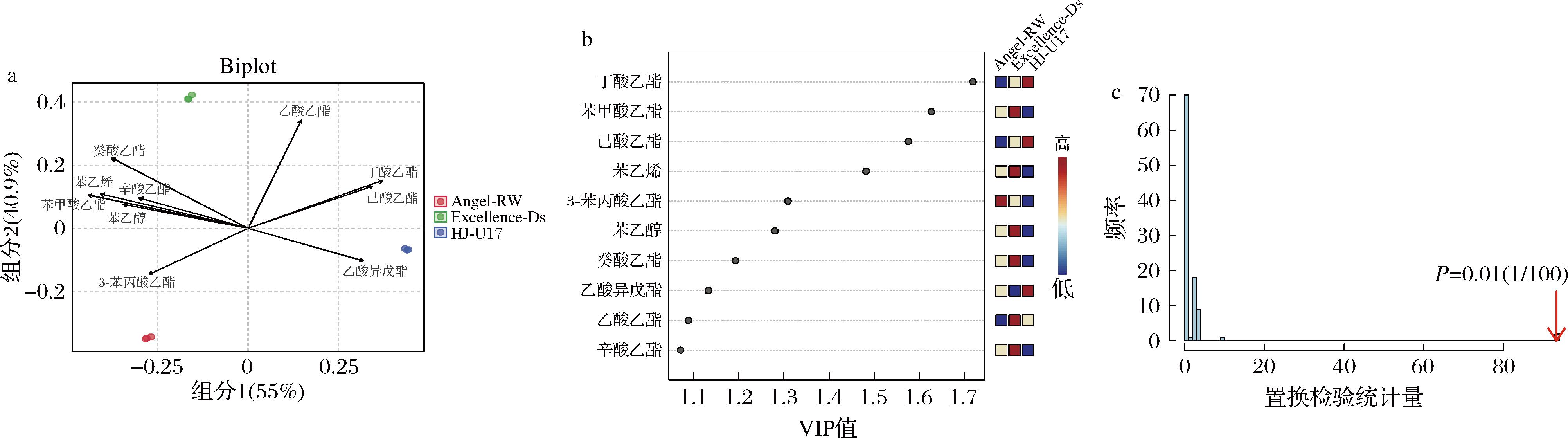 通过PLS-DA鉴别3组沙棘果酒样品中ROAV≥0.1挥发性香气成分,结果如图3所示。由图3-a可知,组分1和组分2的方差贡献率分别为55%和40.9%,累积方差贡献率为95.9%,样本点在组间分散分布,而组内样本独立聚类。置换检验的P值<0.05,表明模型具有统计学显著性(图3-c)。共得到VIP值>1的挥发性香气成分10种(图3-b),3组酒样中关键呈香物质主要区别于酯类,苯甲酸乙酯、苯乙烯、苯乙醇、癸酸乙酯、乙酸乙酯及辛酸乙酯与Excellence-Ds发酵酒样有强相关性,丁酸乙酯、己酸乙酯及乙酸异戊酯与HJ-U17发酵酒样有强相关性,3-苯丙酸乙酯与Angel-RW发酵酒样有强相关性。结果表明,不同酿酒酵母由于对酯类物质合成与积累的代谢差异,塑造了3组独特的沙棘果酒香气特征轮廓,其菌株特异性与关键呈香物质的强关联性,揭示了酵母代谢功能对果酒风味轮廓的决定性作用。