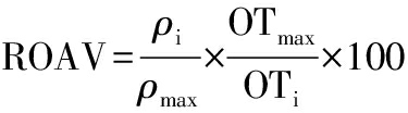 式中:ρi,成分i的相对质量浓度,μg/L;ρmax,OAV最高成分的相对质量浓度,μg/L;OTmax/OTi,阈值比值。