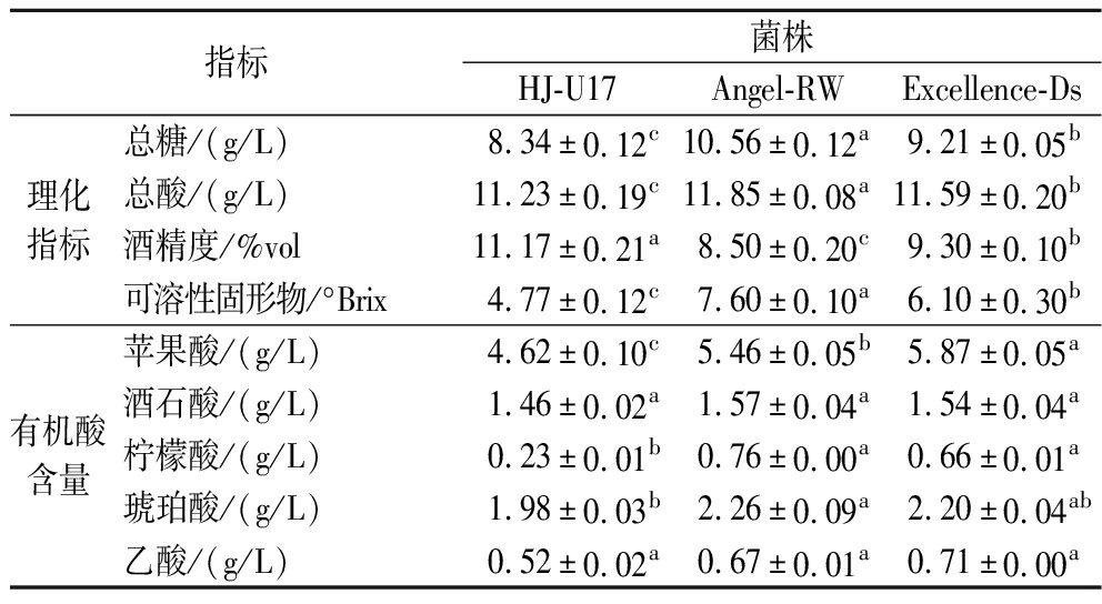 指标菌株HJ-U17Angel-RWExcellence-Ds理化指标总糖/(g/L)8.34±0.12c10.56±0.12a9.21±0.05b总酸/(g/L)11.23±0.19c11.85±0.08a11.59±0.20b酒精度/%vol11.17±0.21a8.50±0.20c9.30±0.10b可溶性固形物/°Brix4.77±0.12c7.60±0.10a6.10±0.30b有机酸含量苹果酸/(g/L)4.62±0.10c5.46±0.05b5.87±0.05a酒石酸/(g/L)1.46±0.02a1.57±0.04a1.54±0.04a柠檬酸/(g/L)0.23±0.01b0.76±0.00a0.66±0.01a琥珀酸/(g/L)1.98±0.03b2.26±0.09a2.20±0.04ab乙酸/(g/L)0.52±0.02a0.67±0.01a0.71±0.00a