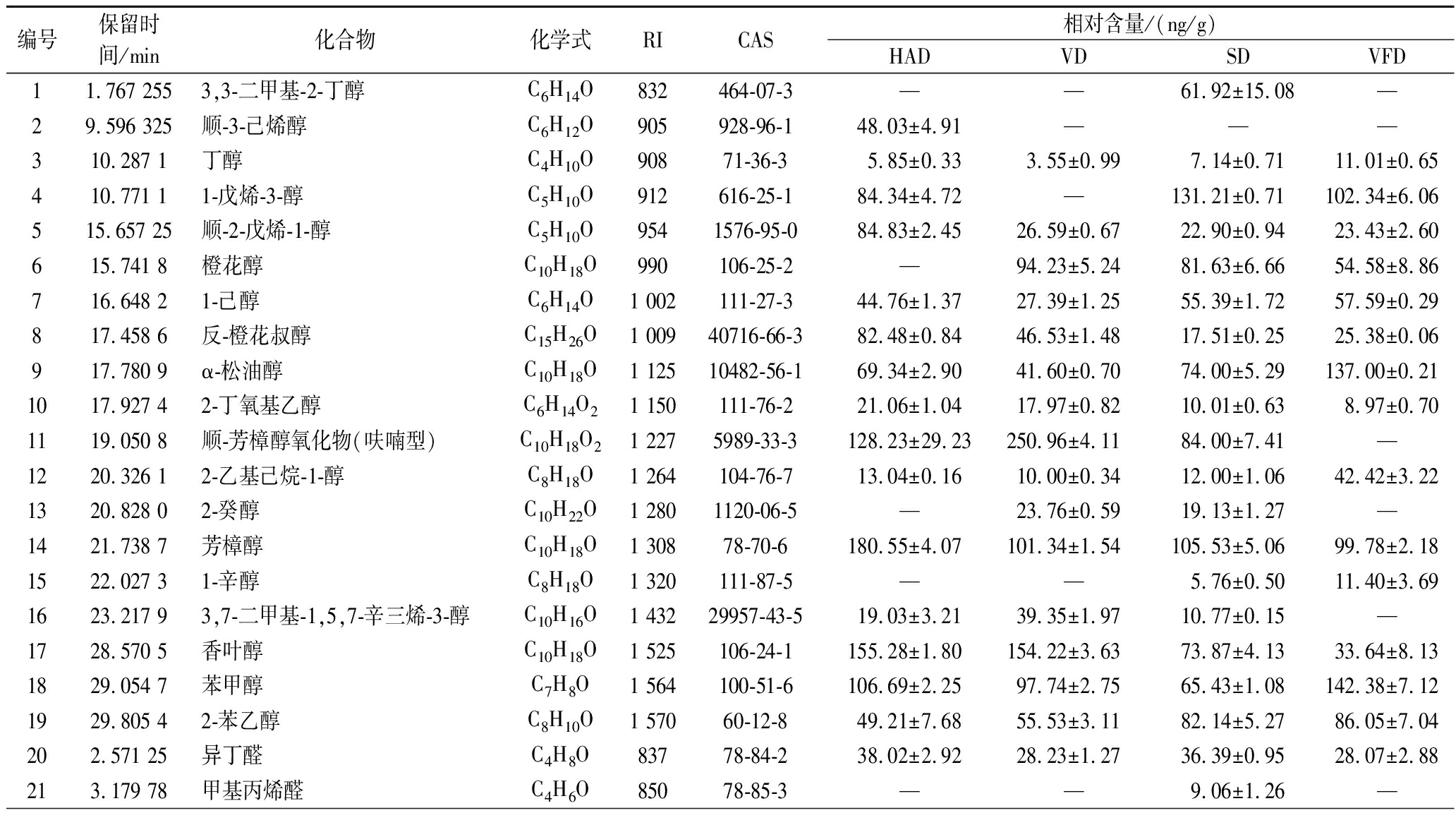 编号保留时间/min化合物化学式RICAS相对含量/(ng/g)HADVDSDVFD11.767 2553,3-二甲基-2-丁醇C6H14O832464-07-3——61.92±15.08—29.596 325顺-3-己烯醇C6H12O905928-96-148.03±4.91———310.287 1丁醇C4H10O90871-36-35.85±0.333.55±0.997.14±0.7111.01±0.65410.771 11-戊烯-3-醇C5H10O912616-25-184.34±4.72—131.21±0.71102.34±6.06515.657 25顺-2-戊烯-1-醇C5H10O9541576-95-084.83±2.4526.59±0.6722.90±0.9423.43±2.60615.741 8橙花醇C10H18O990106-25-2—94.23±5.2481.63±6.6654.58±8.86716.648 21-己醇C6H14O1 002111-27-344.76±1.3727.39±1.2555.39±1.7257.59±0.29817.458 6反-橙花叔醇C15H26O1 00940716-66-382.48±0.8446.53±1.4817.51±0.2525.38±0.06917.780 9α-松油醇C10H18O1 12510482-56-169.34±2.9041.60±0.7074.00±5.29137.00±0.211017.927 42-丁氧基乙醇C6H14O21 150111-76-221.06±1.0417.97±0.8210.01±0.638.97±0.701119.050 8顺-芳樟醇氧化物(呋喃型)C10H18O21 2275989-33-3128.23±29.23250.96±4.1184.00±7.41—1220.326 12-乙基己烷-1-醇C8H18O1 264104-76-713.04±0.1610.00±0.3412.00±1.0642.42±3.221320.828 02-癸醇C10H22O1 2801120-06-5—23.76±0.5919.13±1.27—1421.738 7芳樟醇C10H18O1 30878-70-6180.55±4.07101.34±1.54105.53±5.0699.78±2.181522.027 31-辛醇C8H18O1 320111-87-5——5.76±0.5011.40±3.691623.217 93,7-二甲基-1,5,7-辛三烯-3-醇C10H16O1 43229957-43-519.03±3.2139.35±1.9710.77±0.15—1728.570 5香叶醇C10H18O1 525106-24-1155.28±1.80154.22±3.6373.87±4.1333.64±8.131829.054 7苯甲醇C7H8O1 564100-51-6106.69±2.2597.74±2.7565.43±1.08142.38±7.121929.805 42-苯乙醇C8H10O1 57060-12-849.21±7.6855.53±3.1182.14±5.2786.05±7.04202.571 25异丁醛C4H8O83778-84-238.02±2.9228.23±1.2736.39±0.9528.07±2.88213.179 78甲基丙烯醛C4H6O85078-85-3——9.06±1.26—
