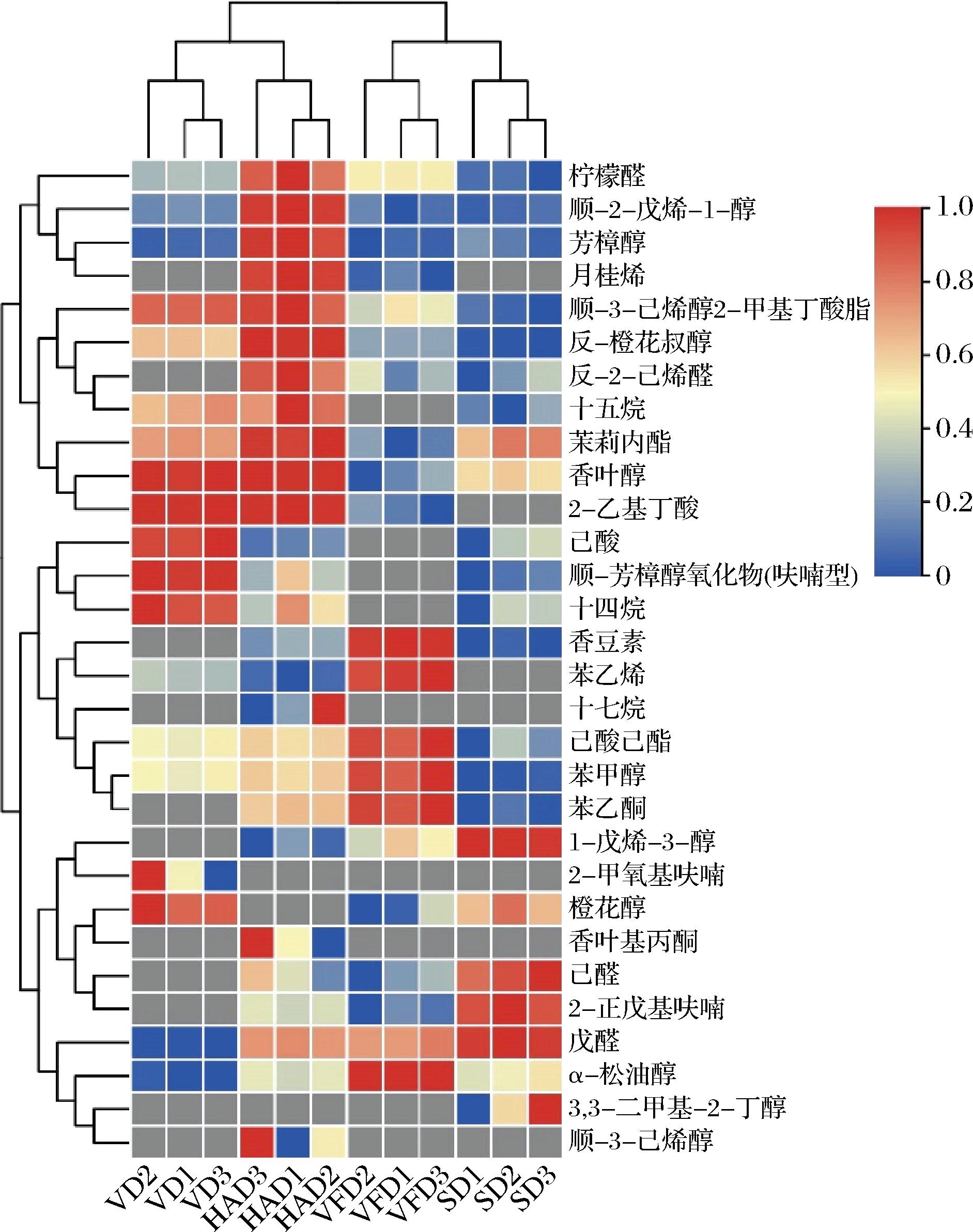 Fig.3 Cluster heatmaps of differential characteristic markers of aroma components in black tea dried by different drying methods