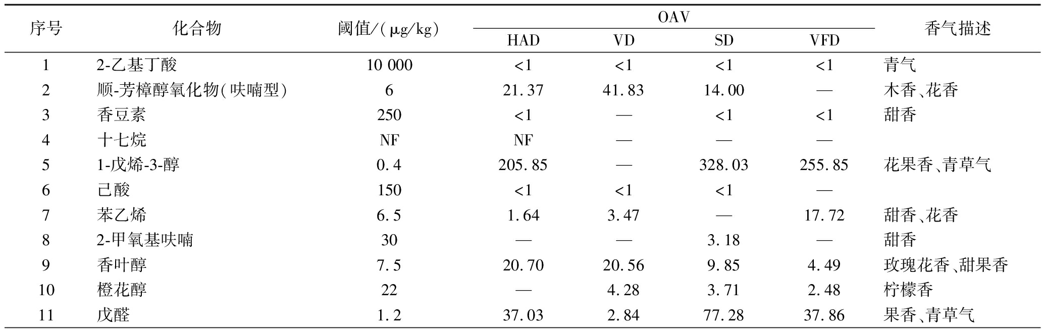 单一香气化合物成分对整体风味的贡献主要取决于其含量和阈值,可通过计算OAV进行表征,评价单个香气对茶叶整体香气的贡献度,通常赋予茶叶香气特征的是具有较高OAV的香气成分。为进一步确定红茶的关键香气成分,基于GC-MS结果,根据VIP>1的标准,筛选出30种差异香气物质,其中HAD、VD、SD、VFD组样品分别筛选出27、18、25和21种。采用OAV评价各个香气组分对样品整体风味的贡献程度,一般认为1≤OAV≤10,该香气成分对整体香气贡献较大;OAV>10,该香气成分对茶叶整体香气贡献极大,且被确定为重要香气成分;0.1≤OAV<1,该物质对整体风味有修饰作用[11]。
