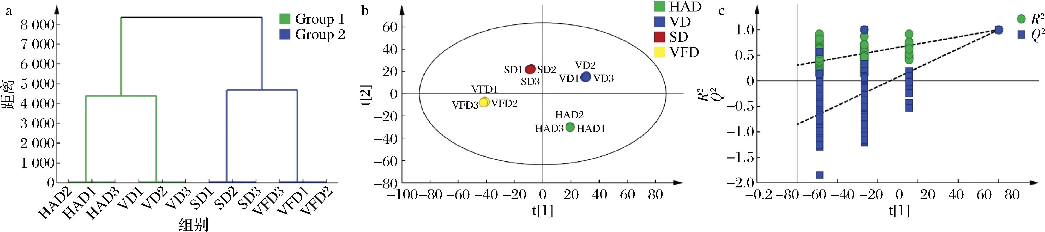 a-HCA图;b-OPLS-DA模型;c-交叉验证