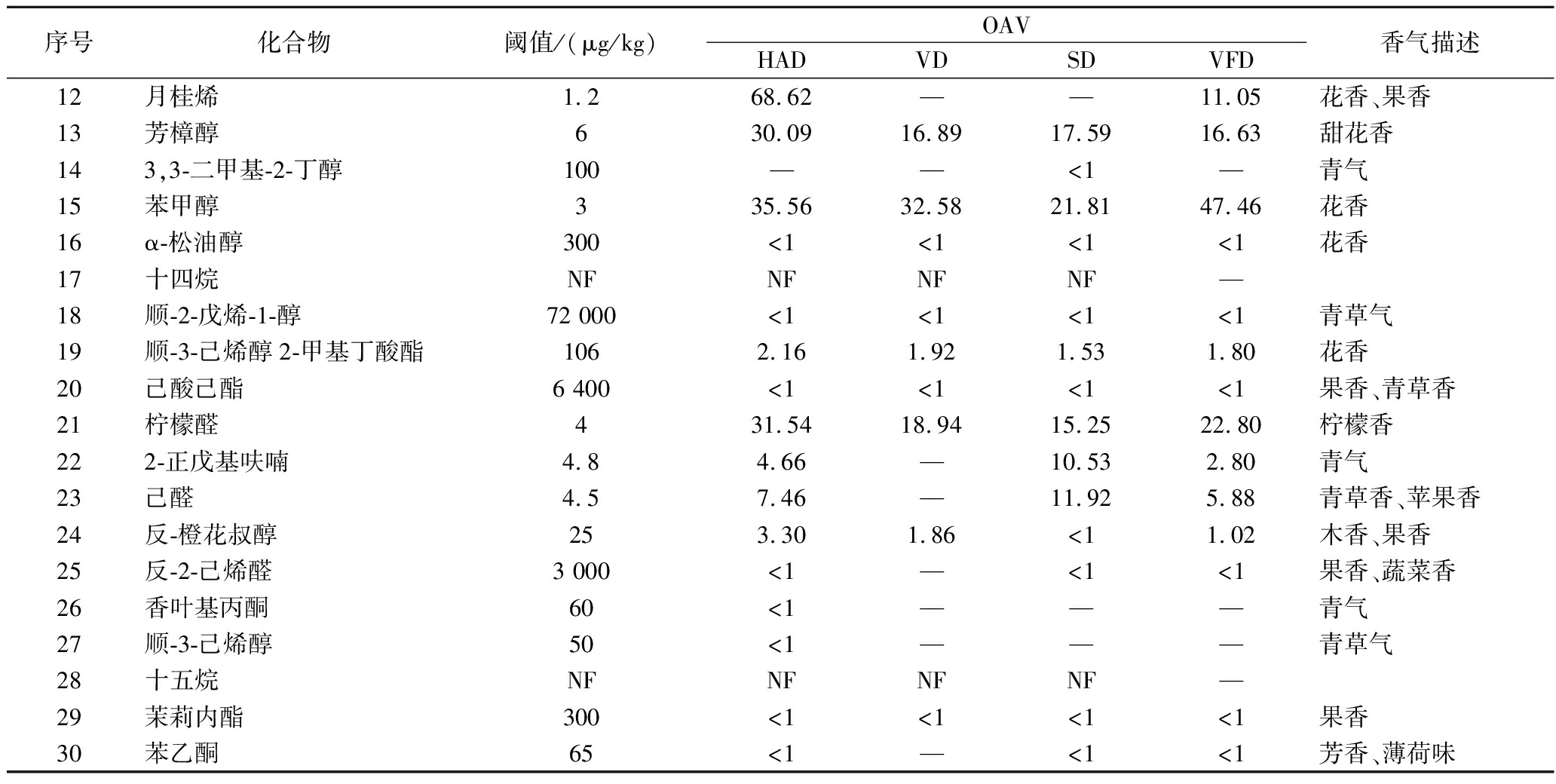 序号化合物阈值/(μg/kg)OAVHADVDSDVFD香气描述12月桂烯1.268.62——11.05花香、果香13芳樟醇630.0916.8917.5916.63甜花香143,3-二甲基-2-丁醇100——<1—青气15苯甲醇335.5632.5821.8147.46花香16α-松油醇300<1<1<1<1花香17十四烷NFNFNFNF—18顺-2-戊烯-1-醇72 000<1<1<1<1青草气19顺-3-己烯醇2-甲基丁酸酯1062.161.921.531.80花香20己酸己酯6 400<1<1<1<1果香、青草香21柠檬醛431.5418.9415.2522.80柠檬香222-正戊基呋喃4.84.66—10.532.80青气23己醛4.57.46—11.925.88青草香、苹果香24反-橙花叔醇253.301.86<11.02木香、果香25反-2-己烯醛3 000<1—<1<1果香、蔬菜香26香叶基丙酮60<1———青气27顺-3-己烯醇50<1———青草气28十五烷NFNFNFNF—29茉莉内酯300<1<1<1<1果香30苯乙酮65<1—<1<1芳香、薄荷味
