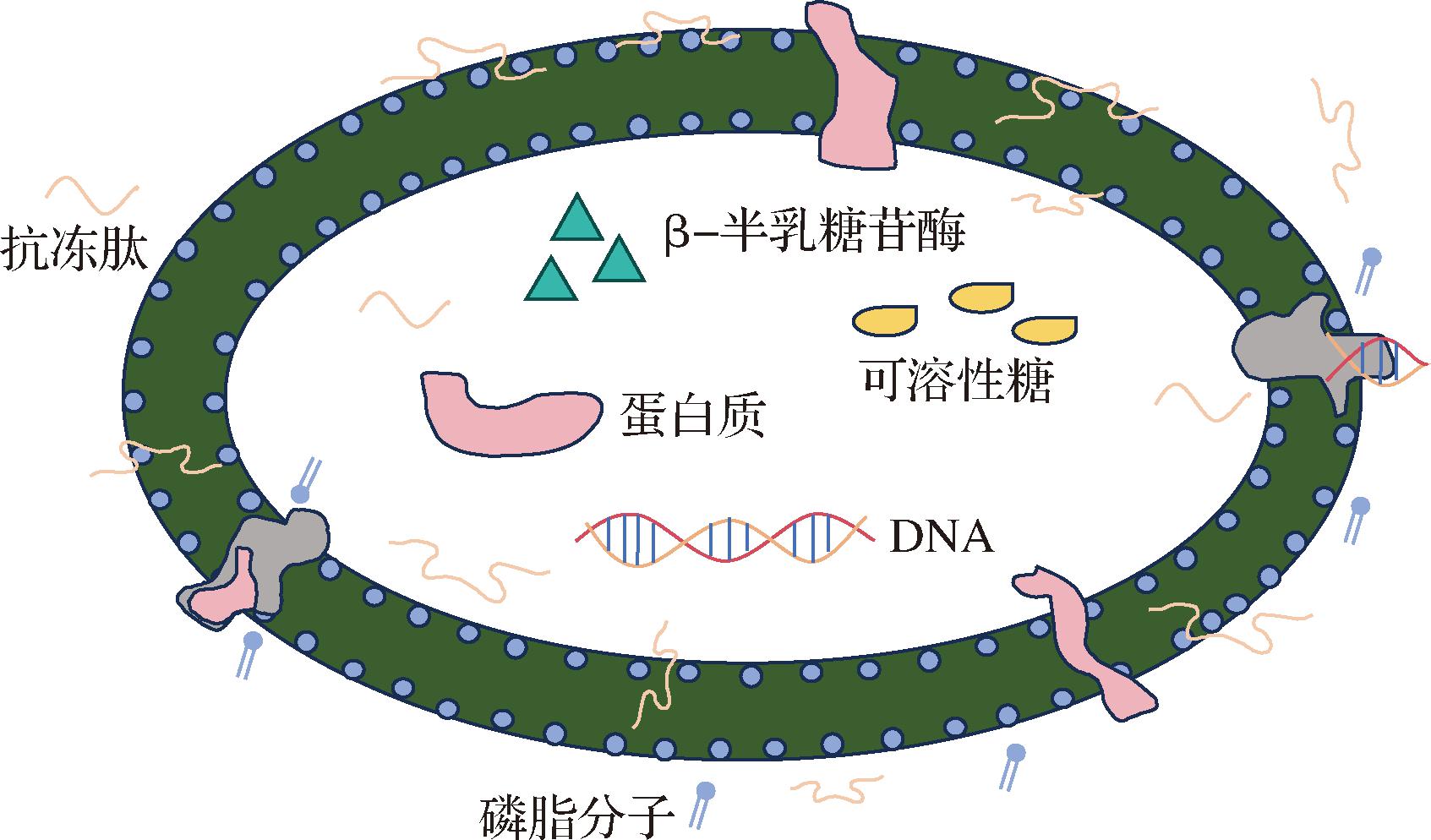 多数低温保护剂为羟基化合物,其中甘油因成本效益比高且保护效果显著,成为一种常用的保护剂。研究证实,随着甘油浓度升高,其对细菌冷冻损伤的防护作用逐渐增强[33]。虽然甘油的有效保护作用已被证实,但细胞结构的不可逆损伤以及较低存活率依旧是难以解决的问题。另外客观存在的细胞毒性问题也影响着其低温保护效果[34]。从细胞膜的结构来看,其表面含有大量水分,通过氢键的作用,在磷脂双分子层周围形成了一层水化层,水化层的存在可维持细胞膜的完整性和稳定性。当环境温度远低于冰点时,部分水分转化为不同形态的冰晶,即使是添加高浓度的保护剂,一部分冰晶仍旧会影响细胞活性,降低细胞膜结构的稳定性[35]。SONG等[36]通过利用AFP和多糖混合物作为包埋材料在低温条件下保护益生菌,发现该材料中抗冻肽的参与可以显著提高益生菌的存活率,维持细胞在低温条件下的活性。从微观机理来看,抗冻肽以氢键的形式与细胞膜结合,抑制低温下冰晶对于细胞膜的损伤,减少胞内物质的泄露。BAZZAZ等[37]发现使用益生菌和抗冻肽这样的生物活性物质相互封装,可以让益生菌成分更高效地输送到特定的结肠区域,提高益生菌的生存能力和生物活性,为满足日益增长的功能性食品需求提供了新的思路和研究方向。
