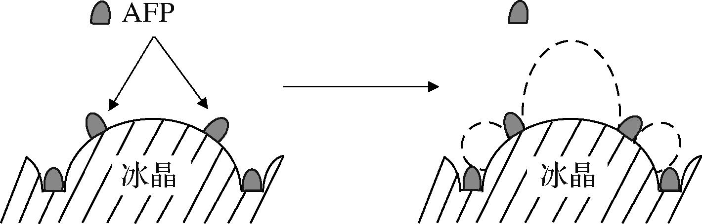 另有研究表明,通过堆叠算法等计算机模拟技术准确识别出了AFP中的特定结构域,并从中发现AFP的局部结构域所产生的抗冻活性可独立发挥抗冻作用[16]。KIM等[17]发现抗冻肽的α螺旋构象能够提升其结合冰面的能力,在低温条件下使冰晶结构出现裂缝等现象,成功抑制冰晶的进一步生长,避免被保护对象的功能损失,以上这些现象与开尔文效应中表面曲率调控原理一致。