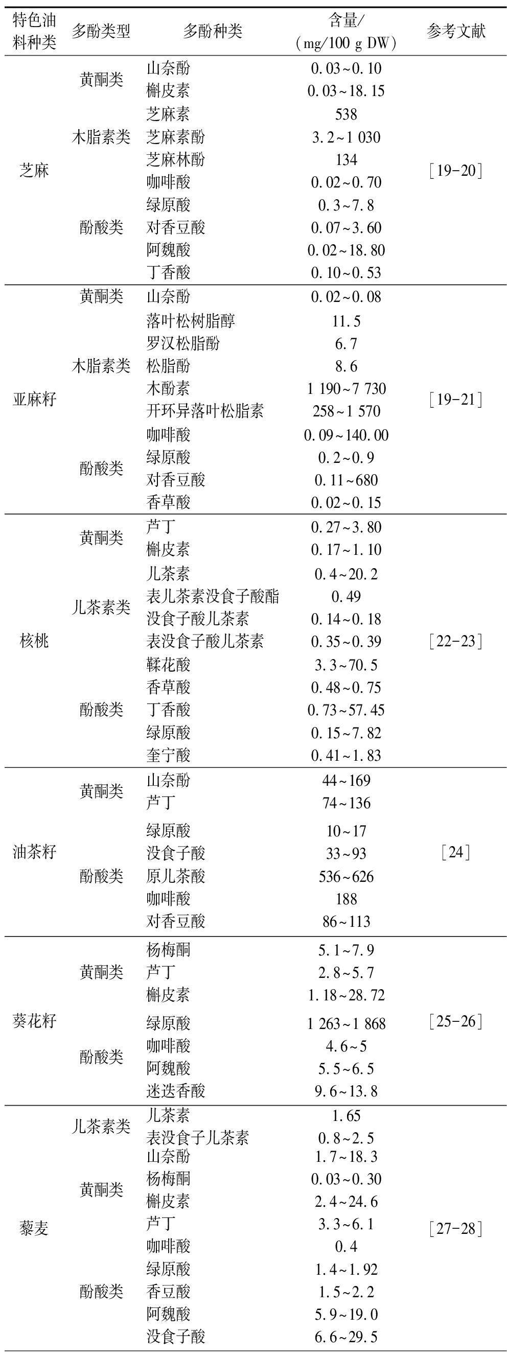 特色油料种类多酚类型多酚种类含量/(mg/100 g DW)参考文献芝麻黄酮类山奈酚槲皮素0.03^0.100.03^18.15木脂素类芝麻素芝麻素酚芝麻林酚5383.2^1 030134酚酸类咖啡酸绿原酸对香豆酸阿魏酸丁香酸0.02^0.700.3^7.80.07^3.600.02^18.800.10^0.53[19-20]亚麻籽黄酮类山奈酚0.02^0.08木脂素类落叶松树脂醇罗汉松脂酚松脂酚木酚素开环异落叶松脂素11.56.78.61 190^7 730258^1 570酚酸类咖啡酸绿原酸对香豆酸香草酸0.09^140.000.2^0.90.11^6800.02^0.15[19-21]核桃黄酮类芦丁槲皮素0.27^3.800.17^1.10儿茶素类儿茶素表儿茶素没食子酸酯没食子酸儿茶素表没食子酸儿茶素0.4^20.20.490.14^0.180.35^0.39酚酸类鞣花酸香草酸丁香酸绿原酸奎宁酸3.3^70.50.48^0.750.73^57.450.15^7.820.41^1.83[22-23]油茶籽黄酮类山奈酚芦丁44^16974^136酚酸类绿原酸没食子酸原儿茶酸咖啡酸对香豆酸10^1733^93536^62618886^113[24]葵花籽黄酮类杨梅酮芦丁槲皮素5.1^7.92.8^5.71.18^28.72酚酸类绿原酸咖啡酸阿魏酸迷迭香酸1 263^1 8684.6^55.5^6.59.6^13.8[25-26]藜麦儿茶素类儿茶素表没食子儿茶素1.650.8^2.5黄酮类山奈酚杨梅酮槲皮素芦丁1.7^18.30.03^0.302.4^24.63.3^6.1酚酸类咖啡酸绿原酸香豆酸阿魏酸没食子酸0.41.4^1.921.5^2.25.9^19.06.6^29.5[27-28]