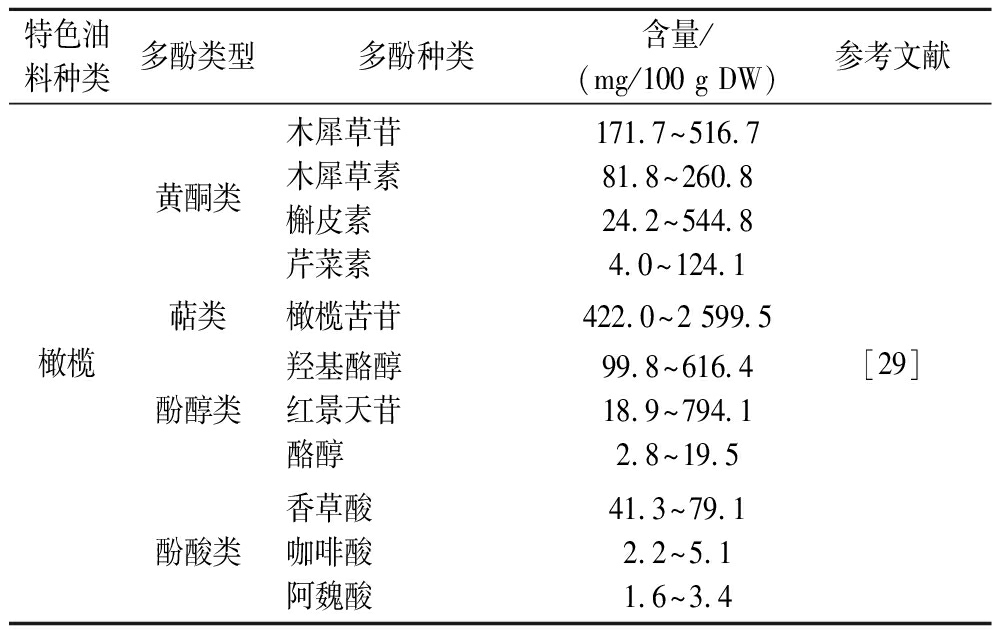 特色油料种类多酚类型多酚种类含量/(mg/100 g DW)参考文献橄榄黄酮类木犀草苷木犀草素槲皮素芹菜素171.7^516.781.8^260.824.2^544.84.0^124.1萜类橄榄苦苷422.0^2 599.5酚醇类羟基酪醇红景天苷酪醇99.8^616.418.9^794.12.8^19.5酚酸类香草酸咖啡酸阿魏酸41.3^79.12.2^5.11.6^3.4[29]