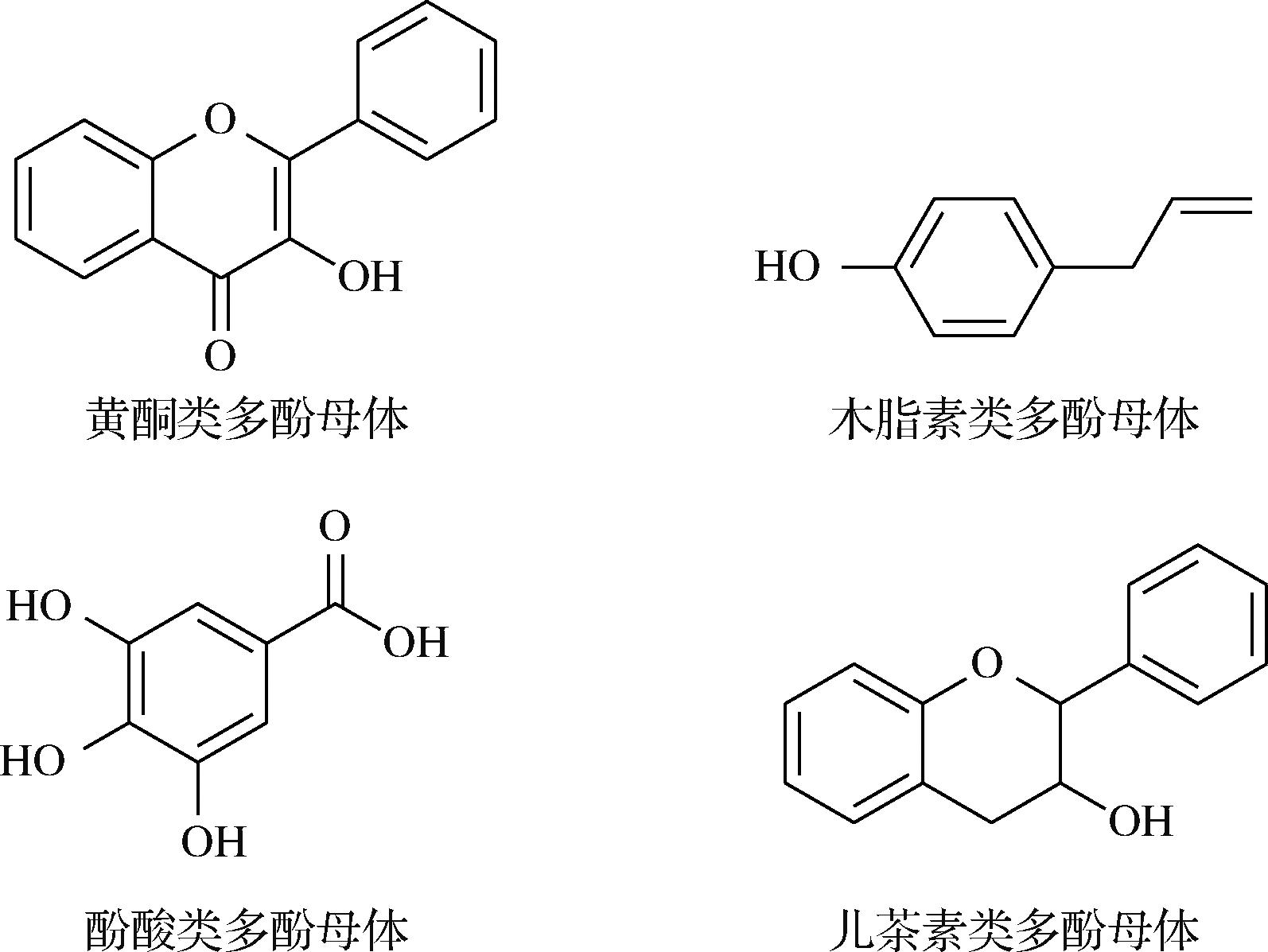 多酚类化合物在自然界中广泛存在,从物质结构可将其分为黄酮类、酚酸类、儿茶素类以及木脂素类几种,其结构式如图1所示[17]。其中黄酮类物质富集于种子和种皮中,主要包括由苯环、苯丙酮骨架和邻二氢苯并呋喃酮环结构组成的槲皮素和芦丁以及苯环、呋喃环及苯丙酮结构组成的山奈酚;酚酸类物质主要存在于特色油料作物的果仁、外层种皮和胚乳中(油橄榄存在于果仁和果皮中),主要包括含有酯键、苯环和碳碳双键的绿原酸、阿魏酸和咖啡酸等;儿茶素类物质在特色油料作物中赋存形态差异较大,在种子和果实的内外部均有不同形态的儿茶素类化合物,主要包括由2个多羟基苯环和三碳的三羟基丙烷桥连接而成的儿茶素和表儿茶素;木脂素类化合物结构特点是含有1个苯环和1个β-双键,这使得它们具有一定的共轭体系和芳香性,大多存在于特色油料的果实和种子外皮,主要包含有木酚素、松脂酚和芝麻素等[18]。