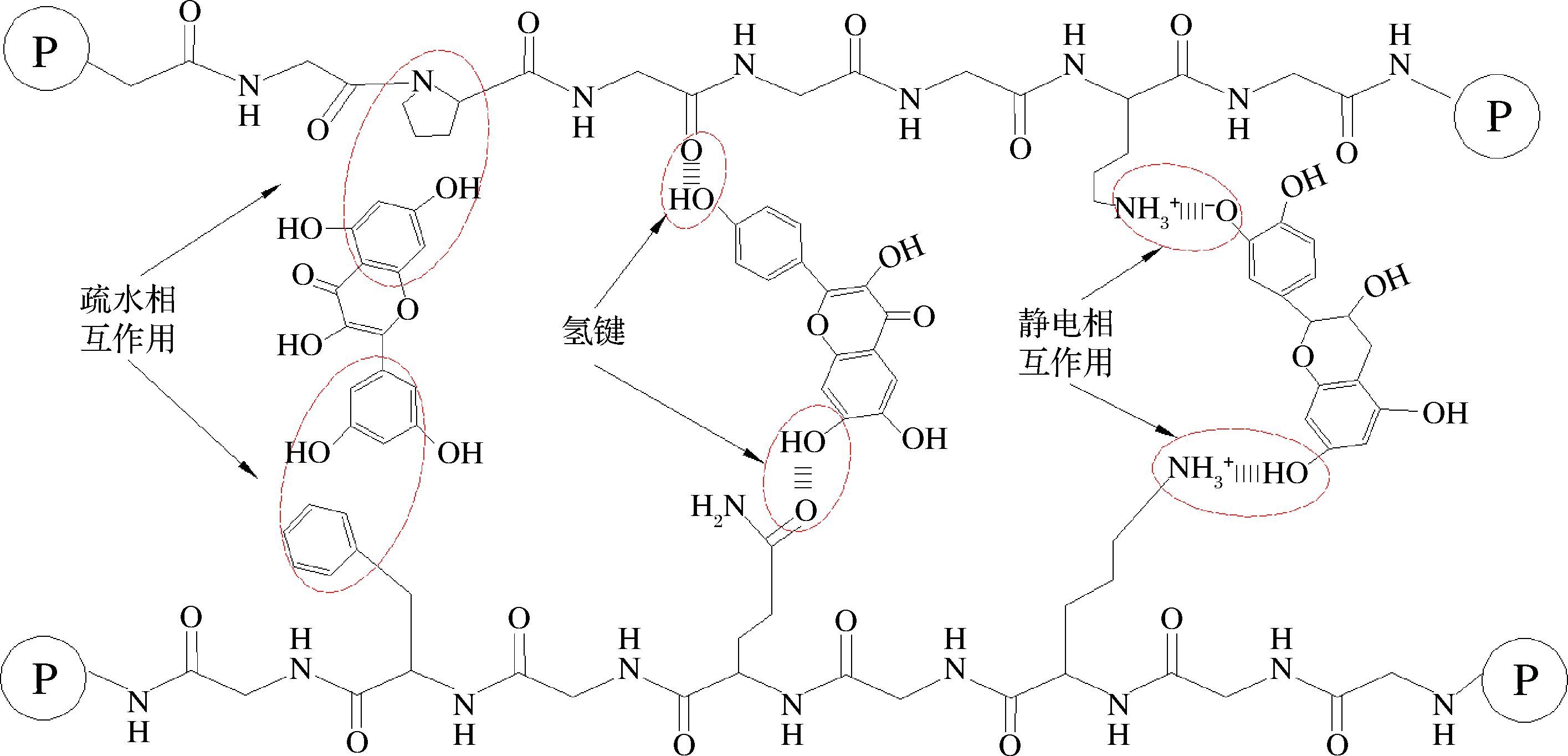 蛋白质和多酚的非共价相互作用包括疏水相互作用、氢键、静电相互作用及范德华力,这些分子间弱相互作用不包括化学键的形成,主要存在于蛋白质氨基与多酚羟基之间(图2)。已有研究表明植物蛋白与多酚间的非共价相互作用是可逆的,且受环境因素影响在不同研究体系中存在动态平衡,通常疏水键>氢键>静电相互作用[11, 30]。