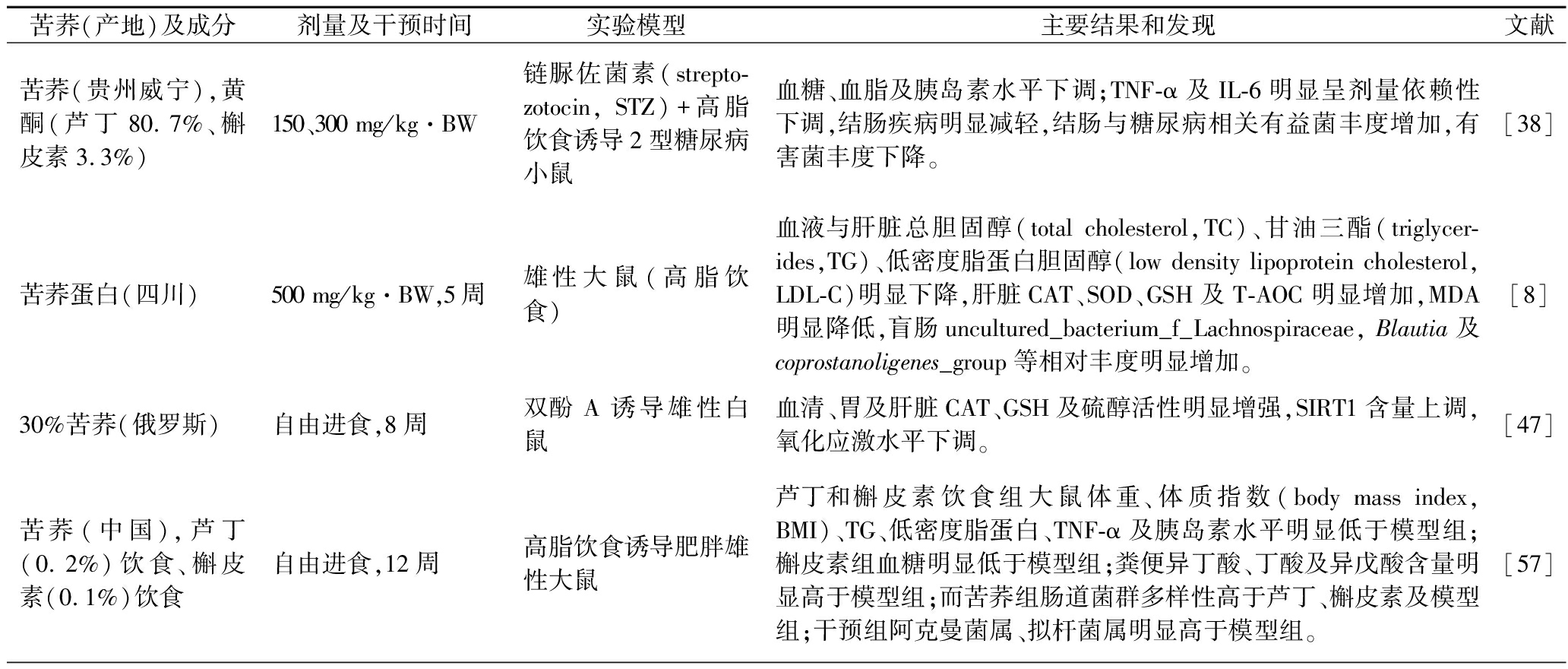 苦荞(产地)及成分剂量及干预时间实验模型主要结果和发现文献苦荞(四川),饲料(22%)自由进食,12周高脂饮食诱导肥胖雄性大鼠血清TG、TC、LDL-C、游离脂肪酸、TNF-α、IL-6、MDA及空腹血糖明显低于模型组,与燕麦效果相当;血清SOD、脂肪细胞因子和T-AOC显著高于模型组;肝脏甾醇调节元件结合蛋白2(sterol regu-latory element-binding protein 2, SREBP-2)和PPAR-γ蛋白表达水平明显低于模型组;肠道菌群多样性及结肠乙酸、丁酸、戊酸含量高于模型组。[58]黑苦荞(中国)0.83 g/kg,8周高脂膳食诱导肥胖大鼠血清胆固醇、TG、LDL-C降低;法尼醇X受体(farnesoid X receptor, FXR)、SREBP1及PPARα蛋白表达水平改变;Lactobacillus、 Fae-calibaculum及Allobaculum相对丰度增加,Romboutsia相对丰度降低;结肠内容物乙酸、丁酸无明显变化;Allobaculum相对丰度与多酚、黄酮、槲皮素及山奈酚呈正相关,与芦丁呈负相关。[59]苦荞(中国台湾,3%、10%添加量),芦丁(0.1%)饲料自由进食,4周高脂膳食+胰高血糖素样肽-1(glucagon like peptide-1,GLP-1)受体基因敲除+STZ诱导雄性2型糖尿病小鼠血清葡萄糖浓度,糖化血红蛋白下降,糖耐受力增强,GLP-1、Ghre-lin、Leptin及Adiponectin水平明显增加,10%苦荞及0.1%芦丁饲料效果优于0.3%苦荞饲料。[15]苦荞(陕西)蛋白(24%),芦丁、槲皮素芦丁、槲皮素(8.2 mmol/kg);苦荞蛋白膳食自由进食,8周雄性仓鼠 苦荞蛋白可降低仓鼠血清TC(45%),显著高于消胆胺(37%)、大米蛋白及小麦蛋白(10%^13%),增加粪便中性甾醇、酸性甾醇的分泌,下调肠道NPC1L1、ACAT2及ABCG5/8蛋白表达水平,上调肝脏CYP7A1基因表达。而芦丁对血清TC没有显著影响。[60]苦荞(四川)膳食纤维及多糖(0.5%,1%,2%)500, 1 500 mg/kg·BW,多糖实验自由进食,8周 C57BL/KSJ-db/db小鼠;STZ+高脂饮食诱导空腹血糖及糖化血红蛋白降低,糖耐受力及胰岛素抵抗、结肠与胰腺损伤改善;磷脂酰肌醇3-激酶(phosphatidylinositol 3 kinase,PI3K)、GPR43、AMPK蛋白表达水平上调;FoxO1、PEPCK及G-6-Pase蛋白表达水平下调,粪便短链脂肪酸(short chain fatty acids, SCFAs)、结肠GPR43及血清GLP-1增加;Parabacteroides, norank_f_Muribaculaceae等相对丰度增加。[61]苦荞(日本)5 000 mg/kg·BW,12周42名男性,107名女性,年龄30^69岁,动脉粥样硬化指数:2.25±0.653周后动脉粥样硬化指数、氧化低密度脂蛋白无明显改变,但8周后硫代巴比妥酸反应物水平、体重及BMI明显低于对照组,4周后BFP显著低于对照组。[62]苦荞多肽(陕西)200 μg/mL,20 hH2O2诱导人源肝癌HepG2细胞T-AOC、SOD、CAT、GSH活性增加;PPAR-α/HO-1蛋白表达水平上调,氧化应激水平下调。[49]苦荞(韩国)提取物及芦丁25、50、100 μg/mL, 芦丁(2.5、5、10 μg/mL),24 h脂多糖及干扰素-γ诱导的炎症RAW264.7细胞NO含量及ROS水平相比模型组显著降低, NF-κB、COX-2及iNOS基因表达水平明显下调。中低浓度苦荞提取物及芦丁对IL-6具有抑制作用,高浓度具有促进作用。[45]苦荞(韩国)乙醇提取物5、10 g/kg膳食,13周高脂饮食诱导肥胖大鼠体重无明显变化,脂肪组织减少,血脂水平下降;脂肪GPDH活性、iNOS、CD11c及NO水平降低,Arg1、AMPK基因表达水平显著增加,脂肪PPAR-γ、aP2、C/EBP-α、TNF-α、IL-6及MCP-1基因表达水平显著降低;肌肉线粒体PGC-1α、SIRT1基因表达水平及SIRT酶活性显著增加。[48]苦荞(四川)荞麦糖醇B1(Fago B1), Fa-go A1DCI:30 mg/kg·BW;Fago A1或 Fago B1:58 mg/kg·BW;体外:0.1^0.5 mmol/L;6周KK-Ay小鼠;HepG2细胞荞麦糖醇和D-手性肌醇(D-chiro-inositol, DCI)抑制血糖浓度持续增加,改善葡萄糖耐受力,增加胰岛素敏感性;荞麦糖醇增加肝脏和肌肉胰岛素受体及PI3K蛋白表达水平,细胞实验中,还能上调PI3K及AKT的表达,且Fago B1效果优于Fago A1和DCI。[56]苦荞(山西)蛋白、抗性淀粉及全粉自由进食,6周饮食诱导肥胖小鼠相比模型组,苦荞蛋白与全粉均能缓解肥胖小鼠脂肪肝、结肠和盲肠炎症水平,苦荞全粉显著降低了血清TC、TG、LDL-C,增加HDL-C,但苦荞抗性淀粉无明显影响。苦荞抗性淀粉和苦荞全粉对肥胖小鼠肠道细菌多样性具有积极作用能降低厚壁菌门/拟杆菌门比例,其中抗性淀粉能增加粪菌属、蛋白增加黏液真杆菌属和瘤胃球菌科菌属,苦荞粉对拟杆菌属、罗姆布茨菌属和产粪甾醇真杆菌属生长具有促进作用,苦荞粉和抗性淀粉对埃氏菌属-志贺氏菌属及丹毒丝梭菌属均有抑制作用。[63]苦荞(贵州)110 g/d,4周临床试验(165名2型糖尿病患者,试验组80人,对照组85人)体重、BMI、血糖水平、糖化血红蛋白、TG及HDL-C无显著变化,胰岛素水平、LDL-C显著降低。[17]