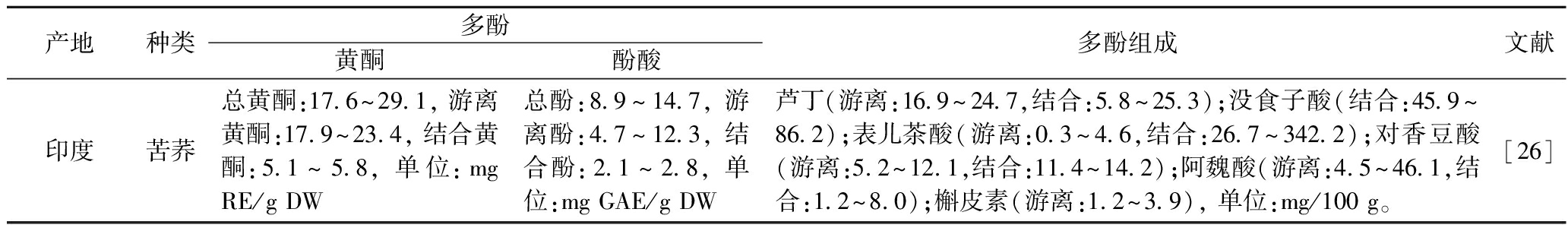 产地种类多酚黄酮酚酸多酚组成文献印度苦荞总黄酮:17.6^29.1, 游离黄酮:17.9^23.4, 结合黄酮:5.1^5.8, 单位:mg RE/g DW总酚:8.9^14.7, 游离酚:4.7^12.3, 结合酚:2.1^2.8, 单位:mg GAE/g DW芦丁(游离:16.9^24.7,结合:5.8^25.3);没食子酸(结合:45.9^86.2);表儿茶酸(游离:0.3^4.6,结合:26.7^342.2);对香豆酸(游离:5.2^12.1,结合:11.4^14.2);阿魏酸(游离:4.5^46.1,结合:1.2^8.0);槲皮素(游离:1.2^3.9), 单位:mg/100 g。[26]