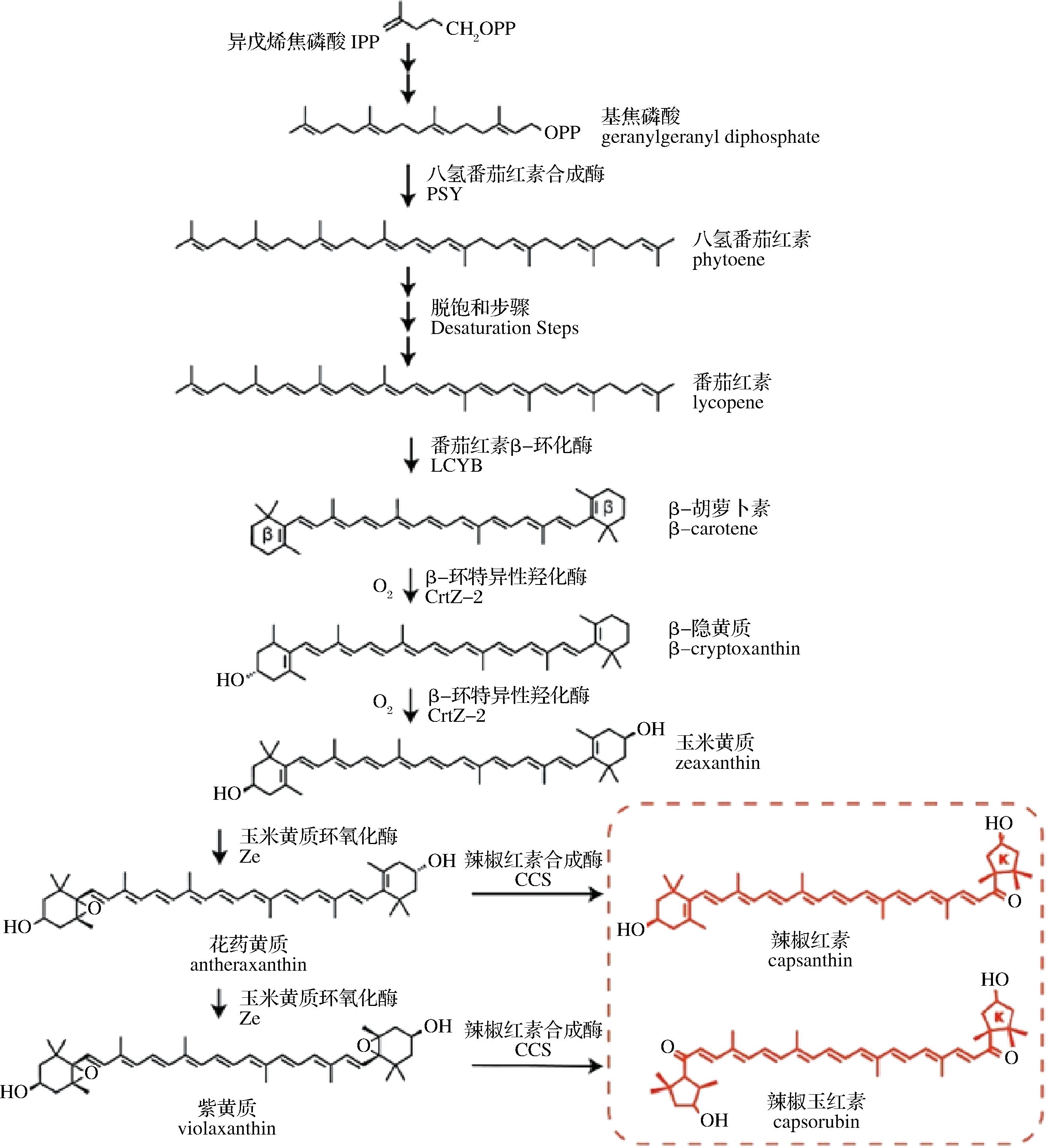 图1 辣椒中辣椒红色素(辣椒红素和辣椒玉红素)的合成途径[17]