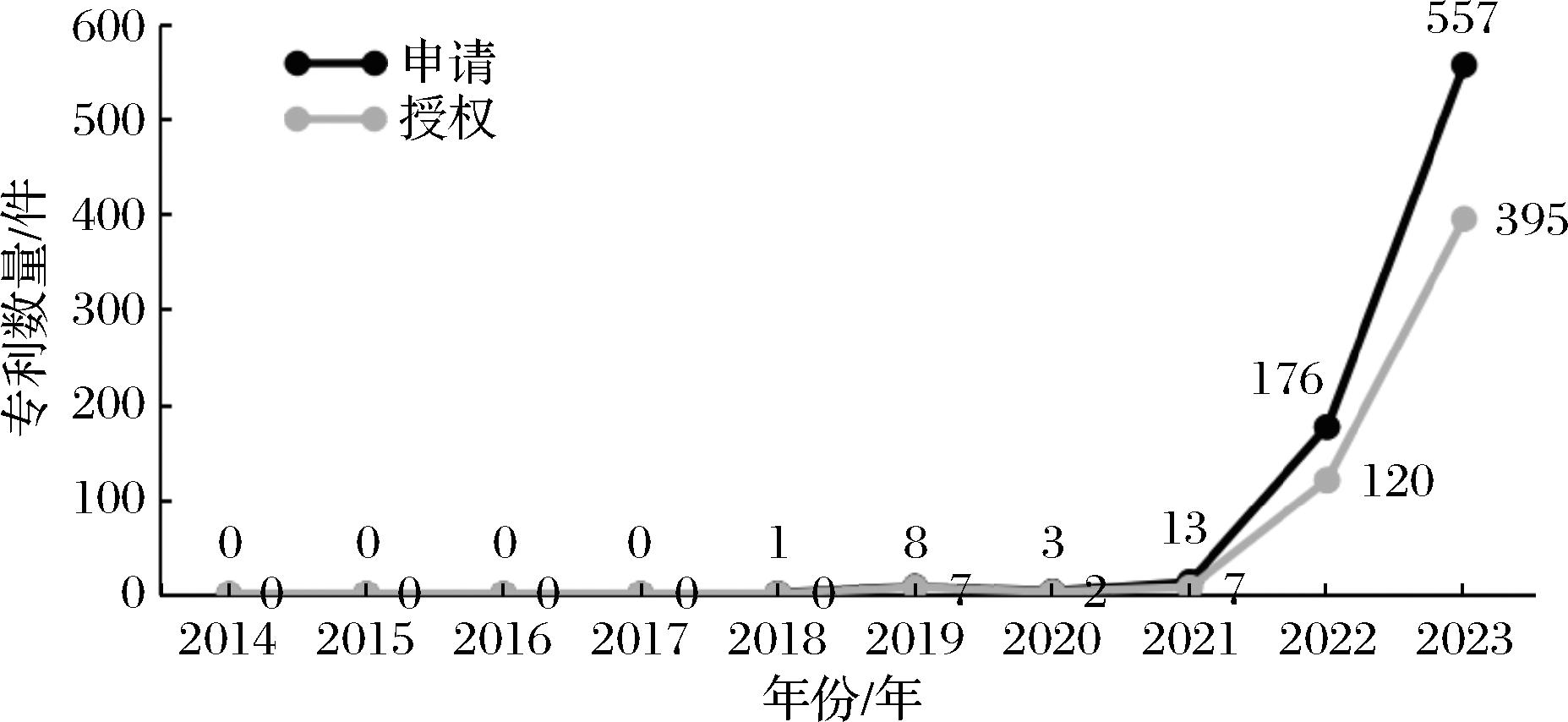 通过检索标题中含有“预制菜”或者“Prefabricated dishes”的专利文件,形成检索式TTL:(“预制菜” or “Prefabricated dishes”),共计检索出专利文件892件。根据专利法的规定,专利公开有18个月的延缓期限,除非专利权人申请提前公开,因此本次检索应当排除了2023年与2024年的专利,但由于预制菜专利是近5年才产生的新生事物,2023年的专利数量已有较大规模,排除后将损失超过一半的样本,故予以保留,检索范围为2014—2023年,10年共计751件专利。