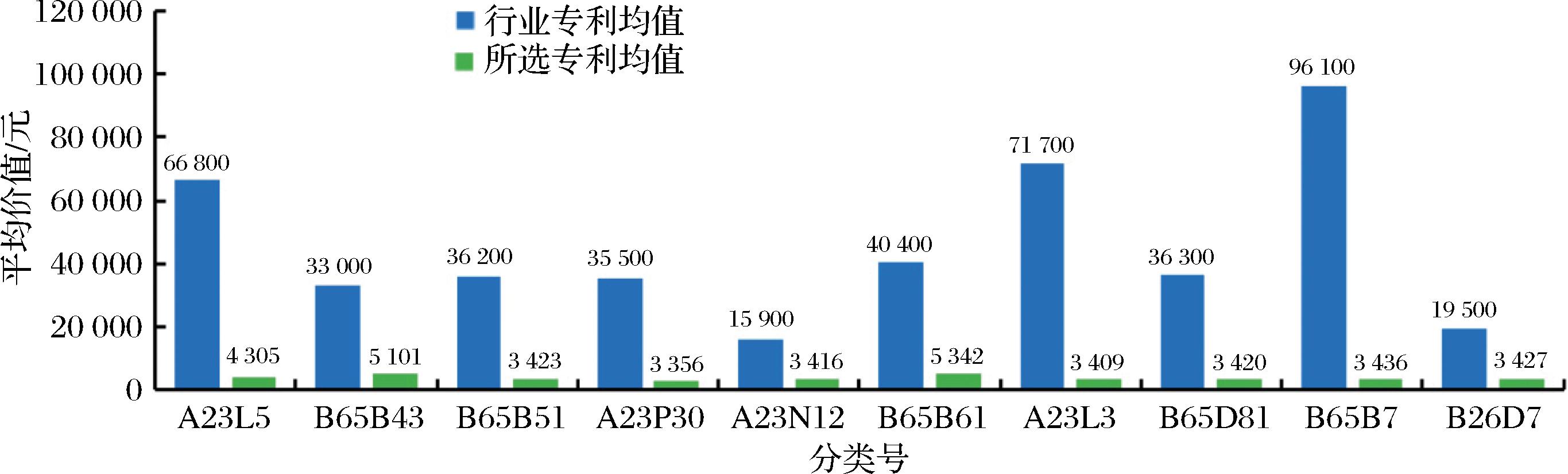 由图4所示,预制菜专利的市场估值与同一IPC类别下的其他专利相差较大,明显低于同一类别下其他专利的均值。根据上文的分析,预制菜的发明专利含量不高,实用新型比重过大,实用新型专利相较于发明专利的研发周期短、投入经费也比较低,此外发明专利保护期为20年,实用新型专利仅为10年,保护周期更短。结合数据库提供的引用、专利国家规模、专利存活期、法律状态等指标,我国预制菜专利的总体市场估值总体较低,也反映出整体的专利质量存在欠缺。