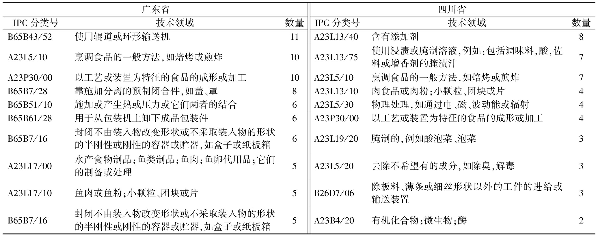 为了展现各省份预制菜专利技术发展的特点及其偏好,本文通过广东和四川预制菜的国际专利分类(international patent classification,IPC)技术领域分布来进行对比分析,两省份分别代表了经济发达省份和菜系特色省份,具体对比见表1。