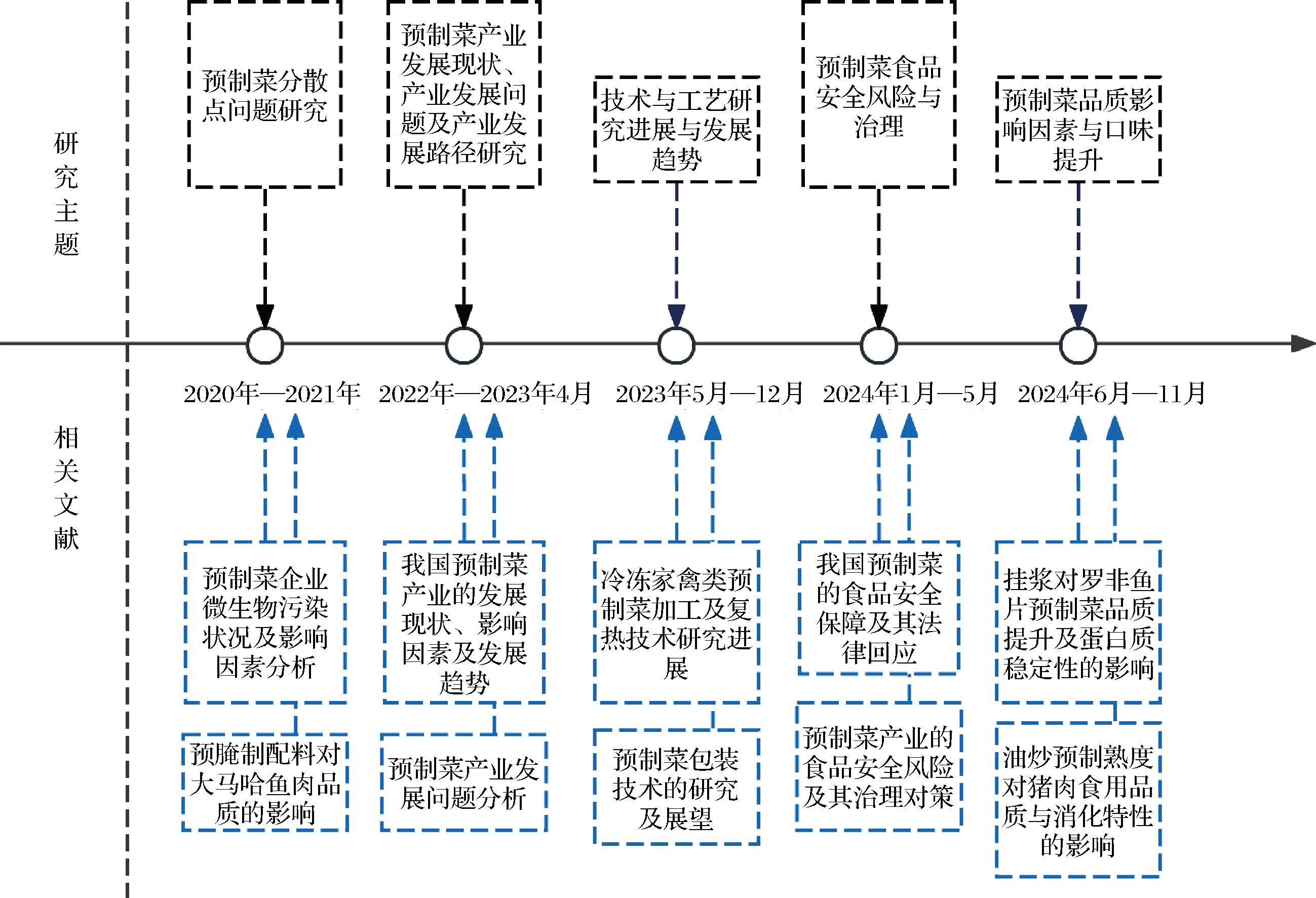 2024年市场监管总局、国家卫生健康委等六部门发文加强预制菜食品安全监管,如何保障预制菜食品安全成为研究重点[14]。2024年1月—5月,以预制菜食品安全为研究主题的文章总被引数占比超过70%。其中,张莉莉等[15]从生产、加工、贮存与运输、销售等环节分析所存在的食品安全风险并提出针对性优化建议,闫夏秋等[16]则重点从法律法规方面完善食品安全保护路径。也有不少研究涉及到具体食品小类预制菜加工中的食品安全问题[17]。2024年6月至今,大众对预制菜品质和口味要求不断提升,在5个月所发表的22篇文章中有11篇均以此为研究主题,学者以不同种类预制菜为研究对象,如鱼肉[18]、猪肉[19]、蔬菜[20]等,如何保障预制菜品质提升的同时尽可能做到口味的还原成为现阶段研究重点。