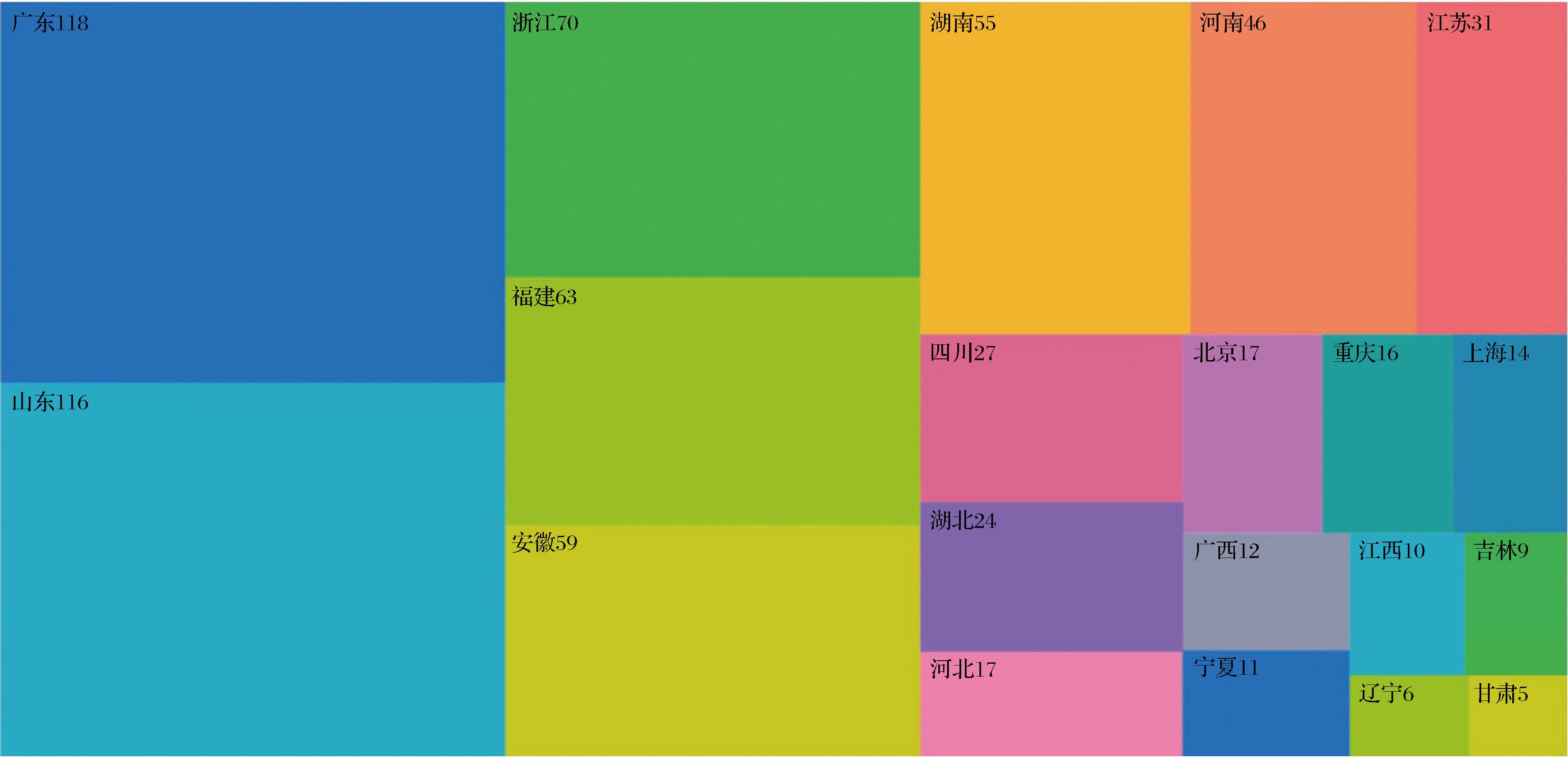 山东、广东、浙江、福建是预制菜专利数量最多的省份,上述4个省份均为沿海且较为发达省份,共计367件专利,占比48%,其中数量最多的是广东省,共118件专利。除此之外,内陆地区的安徽、湖南、河南、四川也有较多的专利数量,这可能与湘菜、川菜在国内受欢迎有一定关联,下文称为菜系特色省份。除去上述省份之外,我国西北部地区存在大量省份没有检索出预制菜相关专利。这表明预制菜产业在上述省份中的受欢迎程度不高或者说还在起步阶段。研究中,粤菜预制菜[21]、湘菜预制菜[22]、川渝预制菜[23]、预制淮扬菜[24]受到较多关注,也有少量学者关注到了较为冷门地区,比如新疆预制菜的发展[25]。