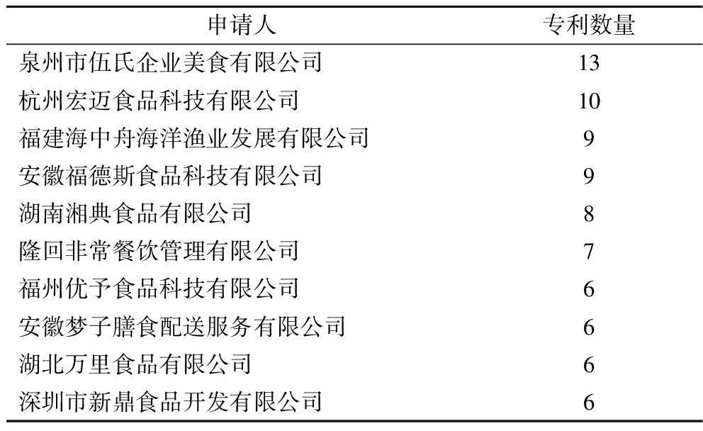 申请人专利数量泉州市伍氏企业美食有限公司13杭州宏迈食品科技有限公司10福建海中舟海洋渔业发展有限公司9安徽福德斯食品科技有限公司9湖南湘典食品有限公司8隆回非常餐饮管理有限公司7福州优予食品科技有限公司6安徽梦子膳食配送服务有限公司6湖北万里食品有限公司6深圳市新鼎食品开发有限公司6