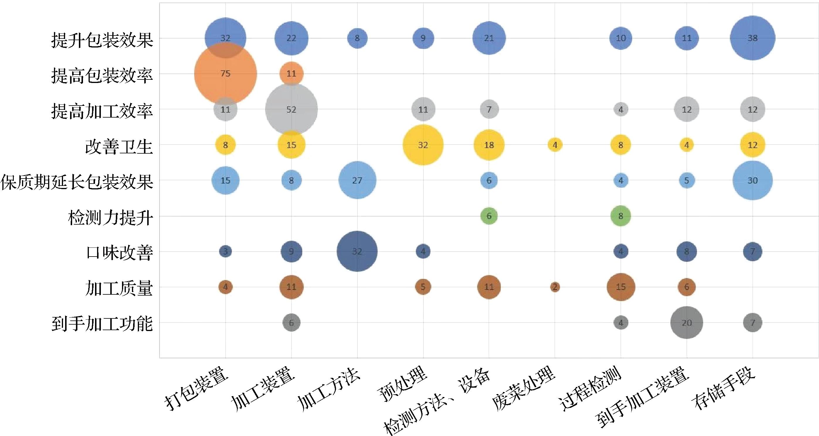 如图6所示,通过技术功效矩阵可以直观识别预制菜的热门和冷门研究领域,矩阵的横坐标为“手段”,纵坐标为“功效”,气泡大小代表出现的频次,气泡越大代表具有某种技术手段且实现某项技术功效的专利越多。