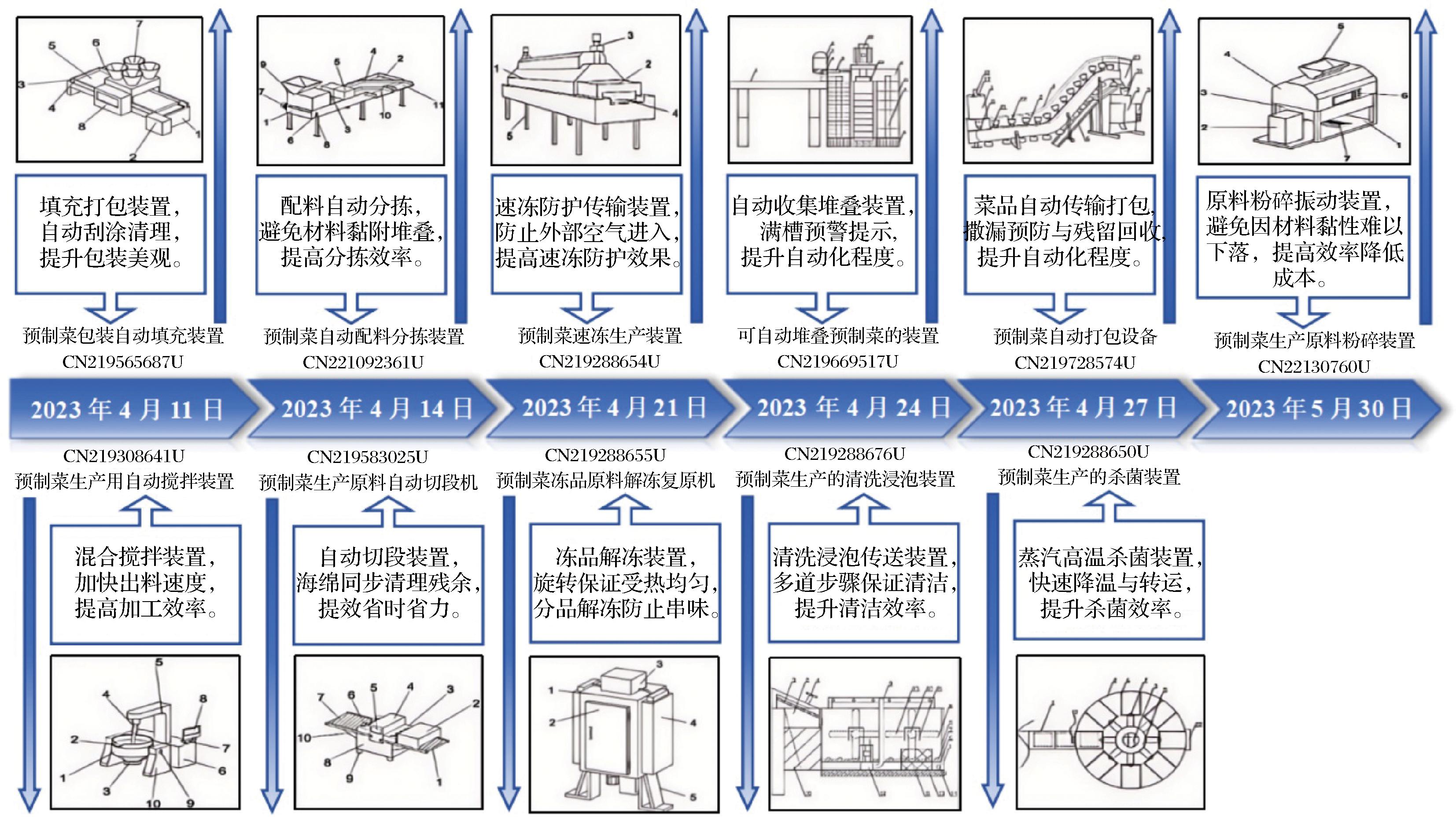 泉州市伍氏企业美食有限公司共持有13项专利,位列第一。通过对上述13件专利分析可知,该公司有意识地进行了专利布局,对预制菜加工的各个生产流程均申请了专利,且均为实用新型专利,可以实现较快授权,起到防御专利的效果。伍氏企业预制菜专利布局情况见图5。首先,该公司专利的技术领域虽然较多,但是申请时间集中在2023年4月—5月。其次,该公司的专利基本涵盖预制菜生产的各个环节,从原料处理、加工、速冻、储存、清洗消毒到包装,每一个环节均有所产出,表明公司正通过专利保护其在整个生产流程中的技术创新,从而构建了一面专利保护网。伍氏企业的专利布局为地毯式专利布局[29],计划性地在生产线的每一个步骤点形成专利,从而为其他竞争者布下地雷区,并且可以整合整体产业链资源,增强公司在市场上的竞争力。