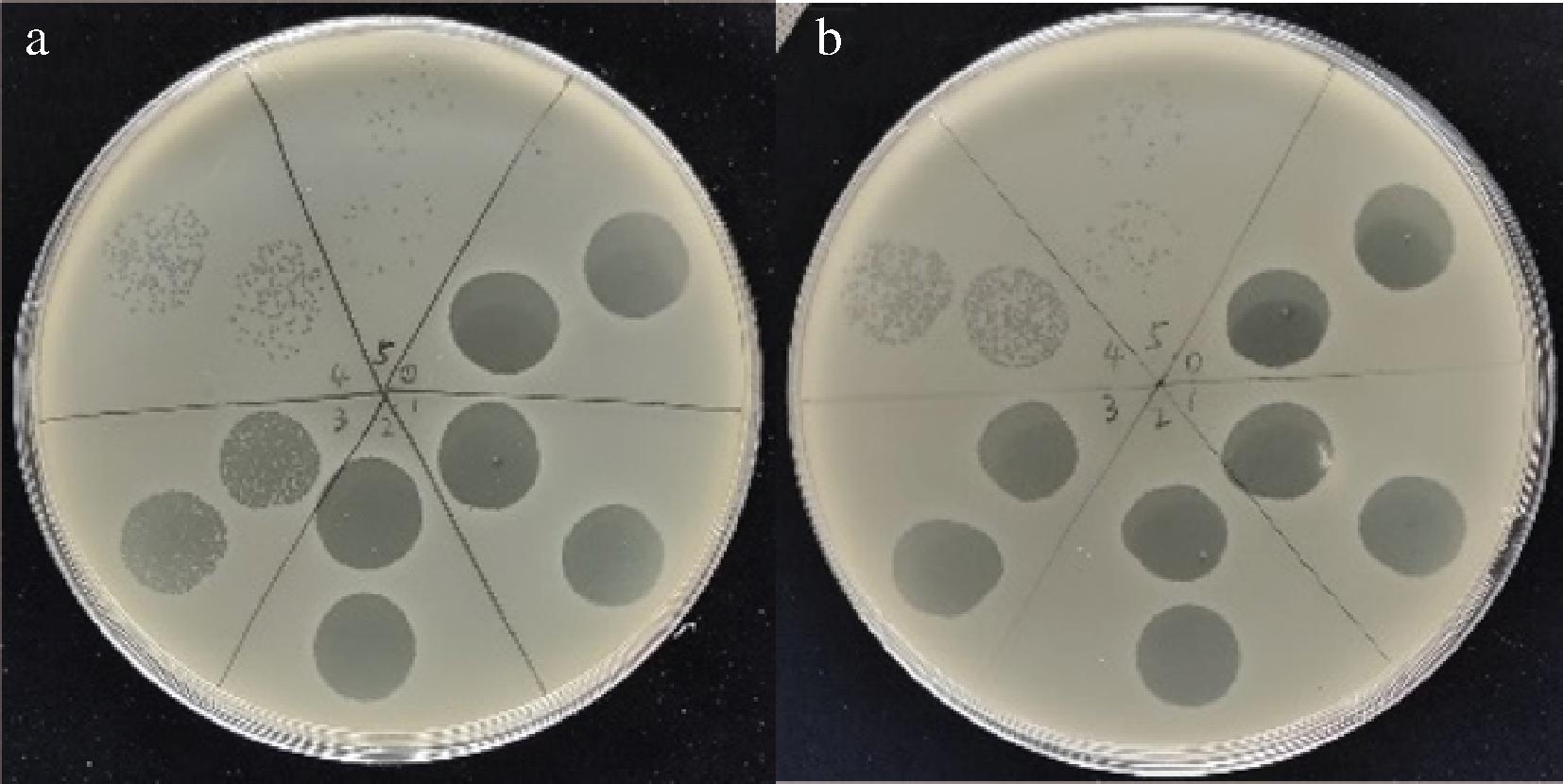 噬菌体EC-p9-1在 SMR的双层板上,有清晰的噬菌斑产生,表明该噬菌体可以裂解SMR(图3-a);噬菌体ZCFSTP4有噬菌斑产生,表明该噬菌体可以裂解SMR(图3-b)。因此选择噬菌体EC-p9-1和ZCFSTP4做后续实验。