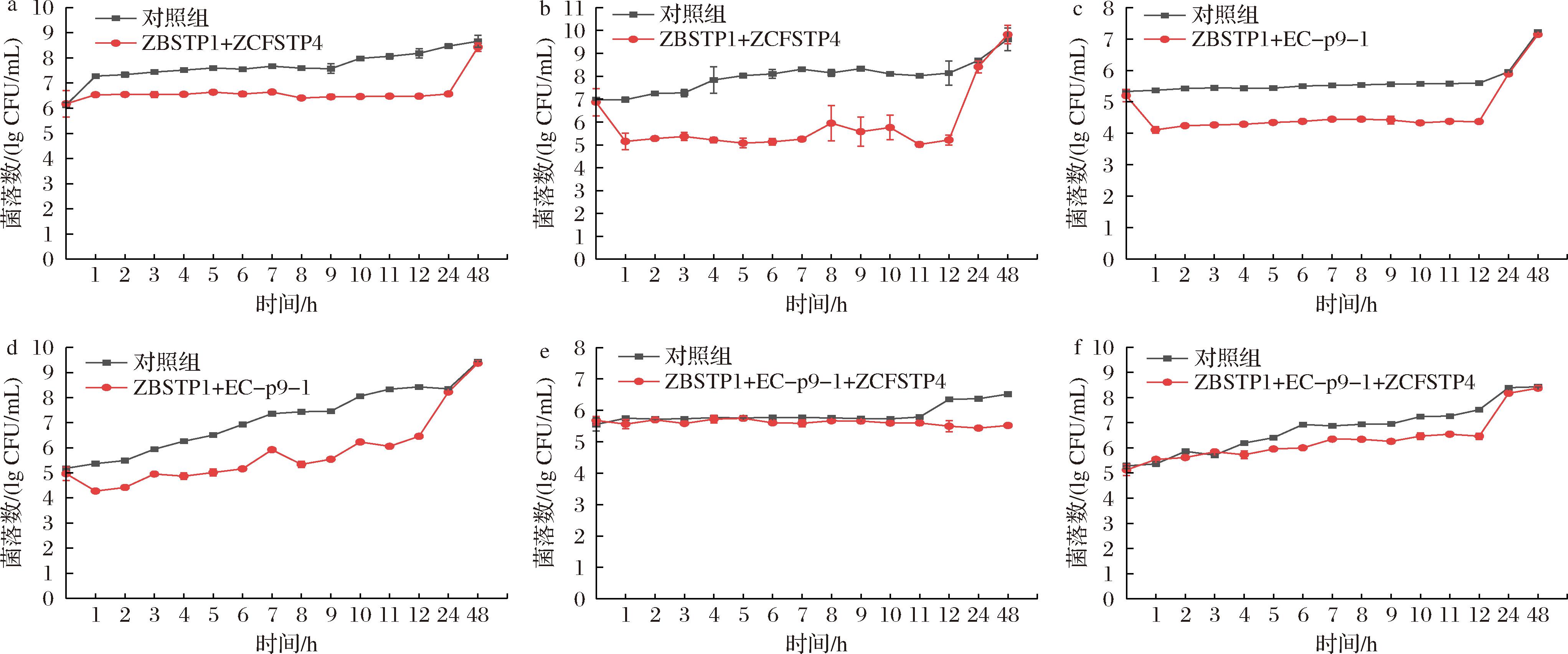 双噬菌体组合ZBSTP1与EC-p9-1及ZBSTP1与ZCFSTP4,每种组合中噬菌体按照1.25%加入,用于抑制沙门氏菌生长。前者加入后1 h抑菌效果增加,在12 h内可以有效抑制沙门氏菌生长且没有耐噬菌体菌株产生;后者自加入后即展现抑菌效果,持续时间8 h。三噬菌体组合ZBSTP1、EC-p9-1和ZCFSTP4,每种噬菌体按照0.82%加入,自加入后开始抑菌,持续时间为8 h,之后有耐噬菌体菌株产生。尽管ZBSTP1+ZCFSTP4组合与ZBSTP1+ EC-p9-1+ZCFSTP4组合抑菌时间较短,但是在抑菌阶段抑菌效果较好(图6-b)。虽然三噬菌体组合中噬菌体种类增加,但抑菌效果相较于双噬菌体组合并未明显增加,其原因可能是噬菌体之间存在某种竞争抑制,一种噬菌体感染细菌后会干扰其他具有共同宿主噬菌体正确组装和繁殖的能力[33],从而影响了噬菌体组合的抑菌效果。