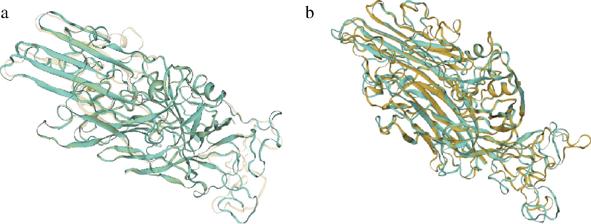 分析噬菌体ZBSTP1和EC-p9-1以及与ZCFSTP4的RBP的相似性,研究噬菌体ZBSTP1、EC-p9-1、ZCFSTP4可以共同裂解沙门氏菌的原因,结果显示:三者RBP相似性为98.03%,表明它们可能对沙门氏菌具有相同的吸附位点,因此三者都可以裂解沙门氏菌(图4-a);其中噬菌体ZBSTP1与EC-p9-1的RBP相似性为96.63%(图4-b),噬菌体ZBSTP1与ZCFSTP4的RBP相似性为96.12%(图4-c);表明噬菌体ZBSTP1与EC-p9-1的RBP之间存在3.37%的差异,表现差异的氨基酸有:天门冬氨酸、谷氨酰胺、甘氨酸、亮氨酸、丝氨酸、苏氨酸、丙氨酸、酪氨酸、缬氨酸、异亮氨酸;噬菌体ZBSTP1与ZCFSTP4的RBP之间存在3.88%的差异,表现差异的氨基酸有:谷氨酰胺、甘氨酸、亮氨酸、天门冬酰胺、丝氨酸、丙氨酸、酪氨酸、缬氨酸、谷氨酸、异亮氨酸。将噬菌体ZBSTP1与ZCFSTP4;ZBSTP1与EC-p9-1的三级结构进行对比,噬菌体EC-p9-1的三级结构标记为黄色,噬菌体ZBSTP1标记为蓝色,三级结构比对见图5-a,噬菌体ZBSTP1的RBP三级结构标记为蓝色,ZCFSTP4标记为黄色,三级结构比对见图5-b,通过三级结构对比,可以看出,氨基酸的不同导致噬菌体ZBSTP1与ZCFSTP4和EC-p9-1也存在结构差异。以上差异可能是导致EC-p9-1、ZCFSTP4可以裂解抗性菌的原因。