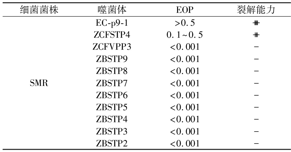 噬菌体EC-p9-1的EOP值>0.5,表明该噬菌体对SMR具有高裂解能力;噬菌体ZCFSTP4的EOP值在0.1~0.5之间,表明该噬菌体对SMR具有中等裂解能力;噬菌体ZCFVPP3、ZBSTP9、ZBSTP8、ZBSTP7、ZBSTP6、ZBSTP5、ZBSTP4、ZBSTP3、ZBSTP2在抗性菌的双层板上没有产生噬菌斑,其EOP值小于0.001,表明噬菌体不能裂解SMR(表2)。
