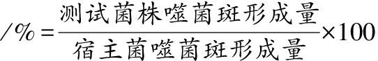 挑取SMR的单菌落于20 mL LB培养基中,摇床培养16 h,制成菌悬液。倒SMR的双层平板,分别用增殖后的噬菌体原液进行点板,于37 ℃培养16 h,观察有无噬菌斑。取过夜培养的沙门氏菌和SMR菌液,采用双层平板法进一步测定噬菌体的成斑效率(efficiency of plaquing,EOP)值[29],记录噬菌斑数量,成斑效率计算如公式(1)所示。EOP≥0.5表明对该细菌具有高裂解能力(++++),0.1≤EOP<0.5表明裂解效果中等(+++),0.001≤EOP<0.1表明裂解效果低(++),EOP <0.001(-)表明噬菌体不能裂解该细菌。选择出最终能裂解抗性菌的噬菌体进行后续实验。