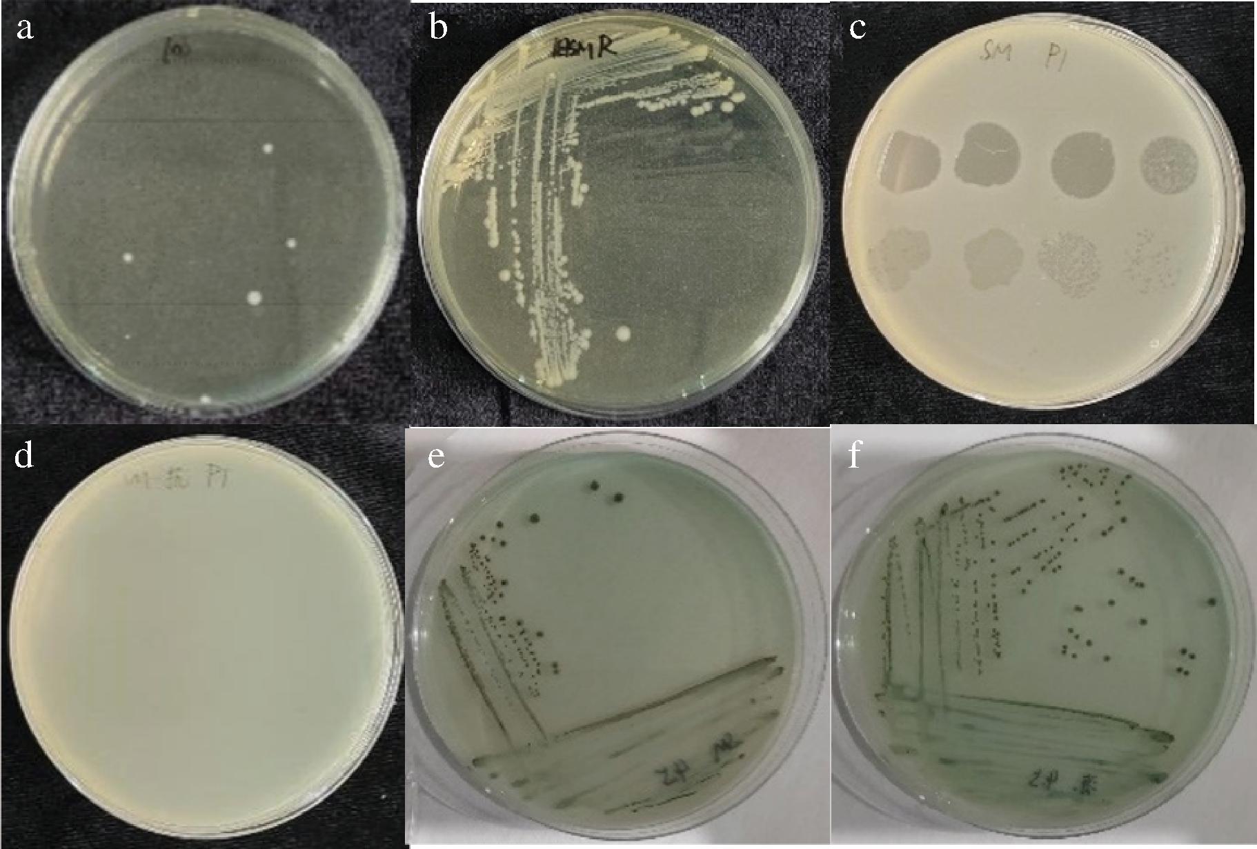a-抗性菌分离;b-抗性菌纯化;c-ZBSTP1裂解沙门氏菌;d-ZBSTP1不裂解抗性菌;e-沙门氏菌菌落形态;f-抗性菌菌落形态