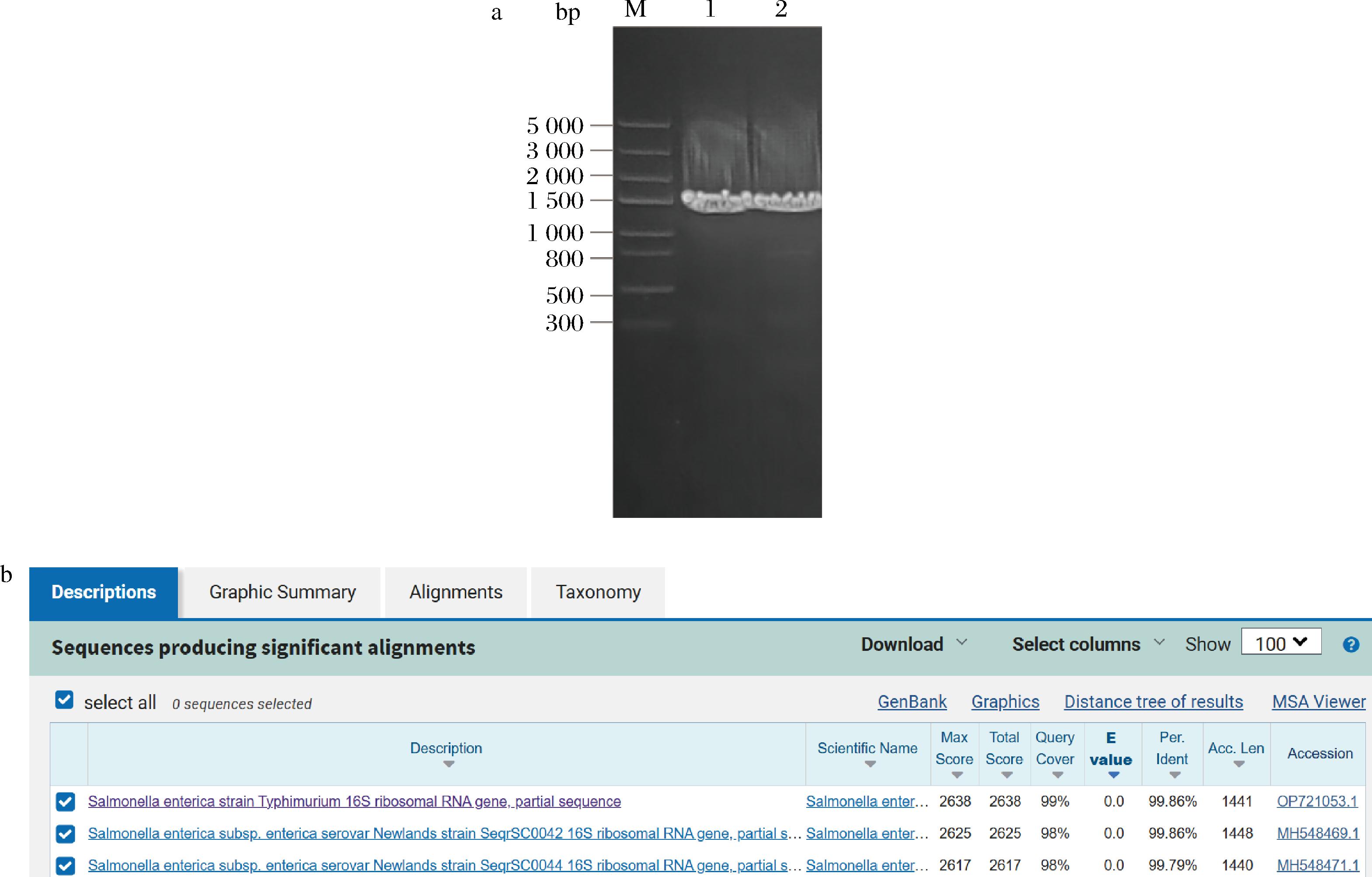 M:5 000 bp Marker;1:沙门氏菌;2:抗性菌。a-凝胶电泳检测16S rRNA图;b-抗性菌测序结果比对
