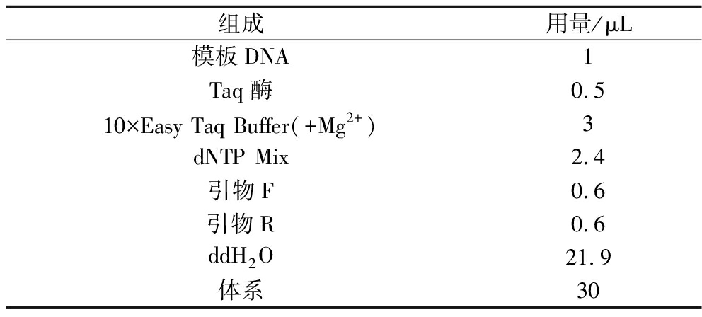 组成用量/μL模板DNA1Taq酶0.510×Easy Taq Buffer(+Mg2+)3dNTP Mix2.4引物F0.6引物R0.6ddH2O21.9体系30
