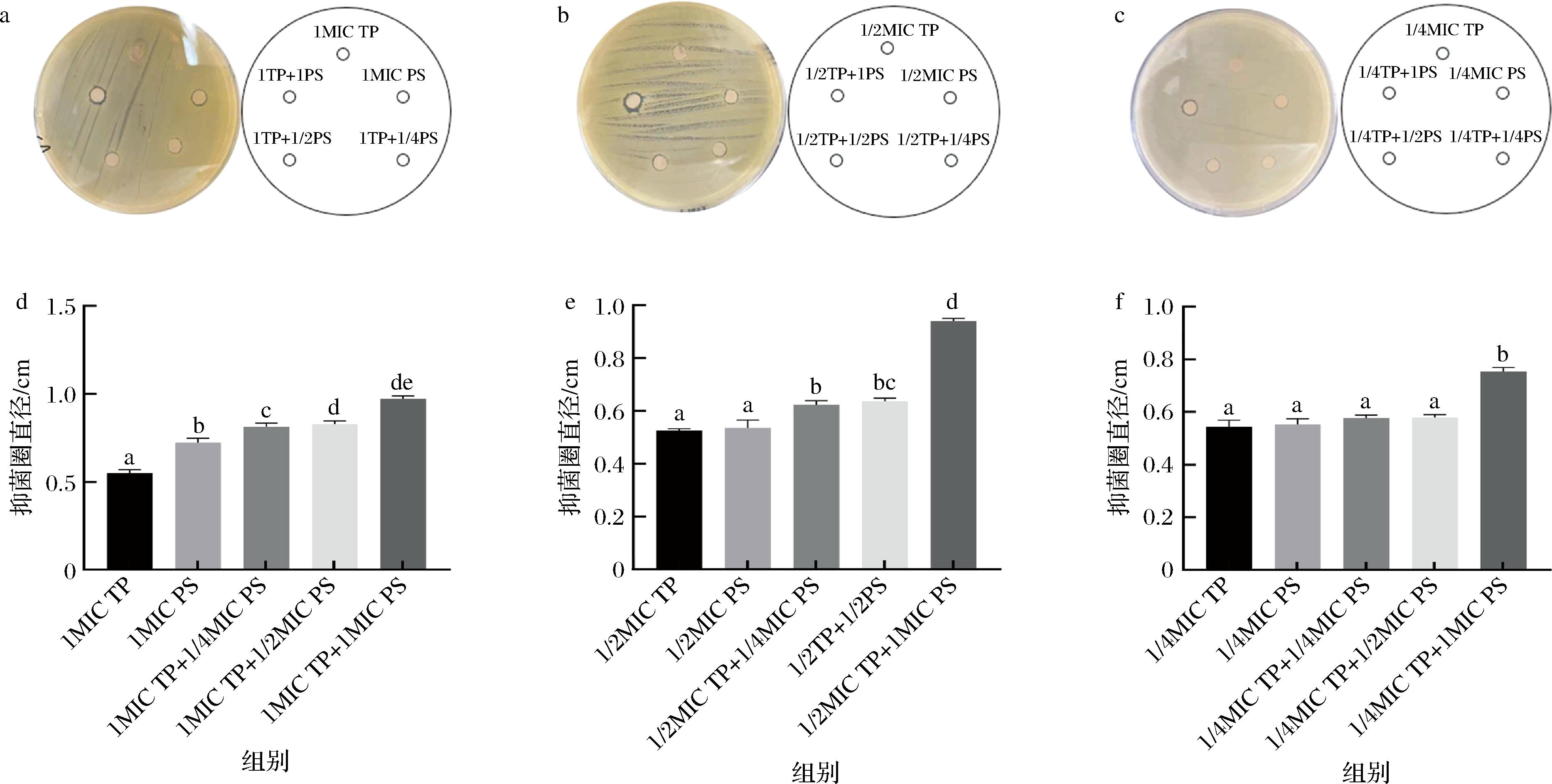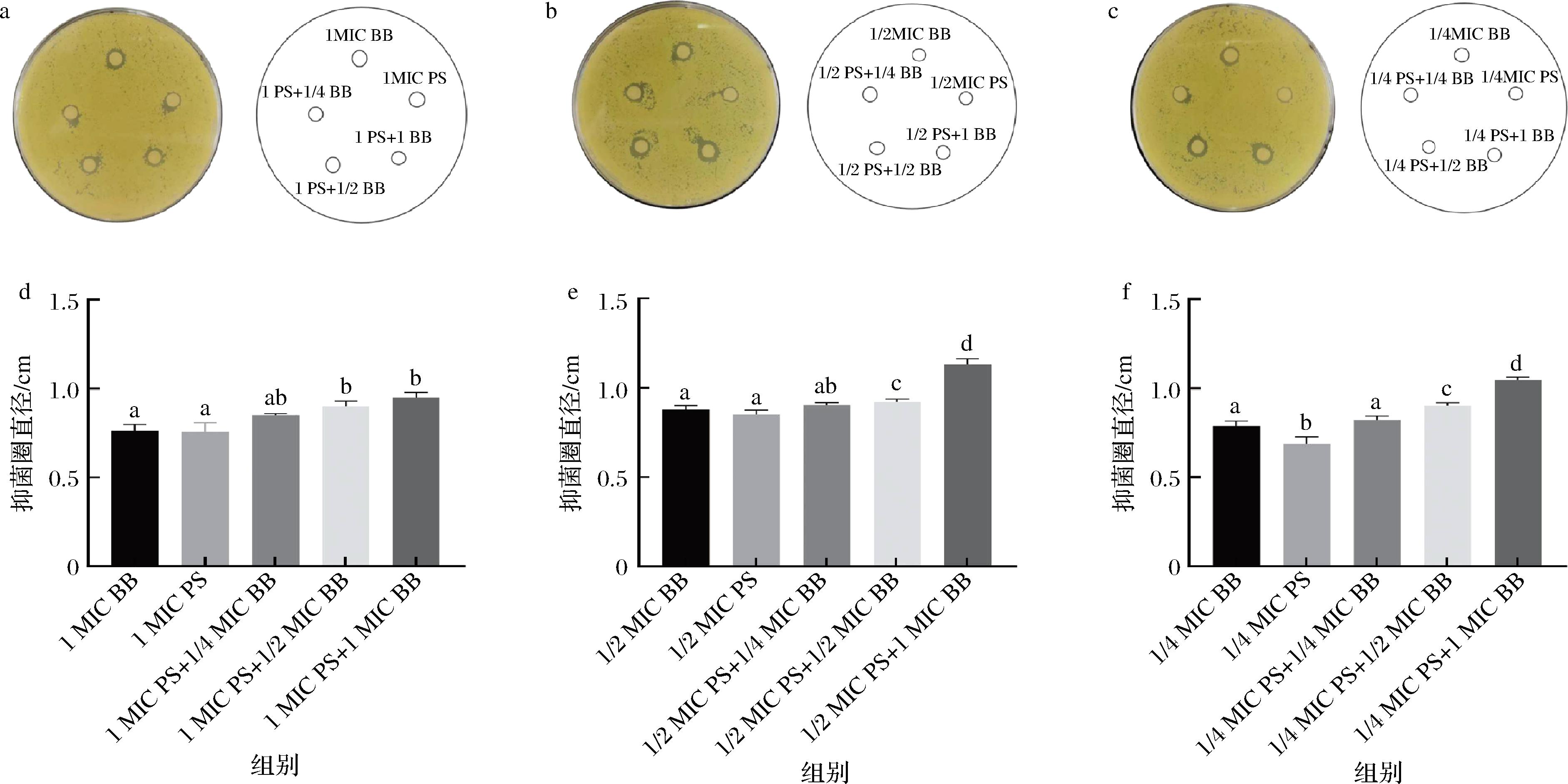 a-1 MIC琼脂平板图像;b-1/2 MIC琼脂平板图像;c-1/4 MIC琼脂平板图像;d-1 MIC抑菌直径;e-1/2 MIC抑菌直径;f-1/4 MIC抑菌直径