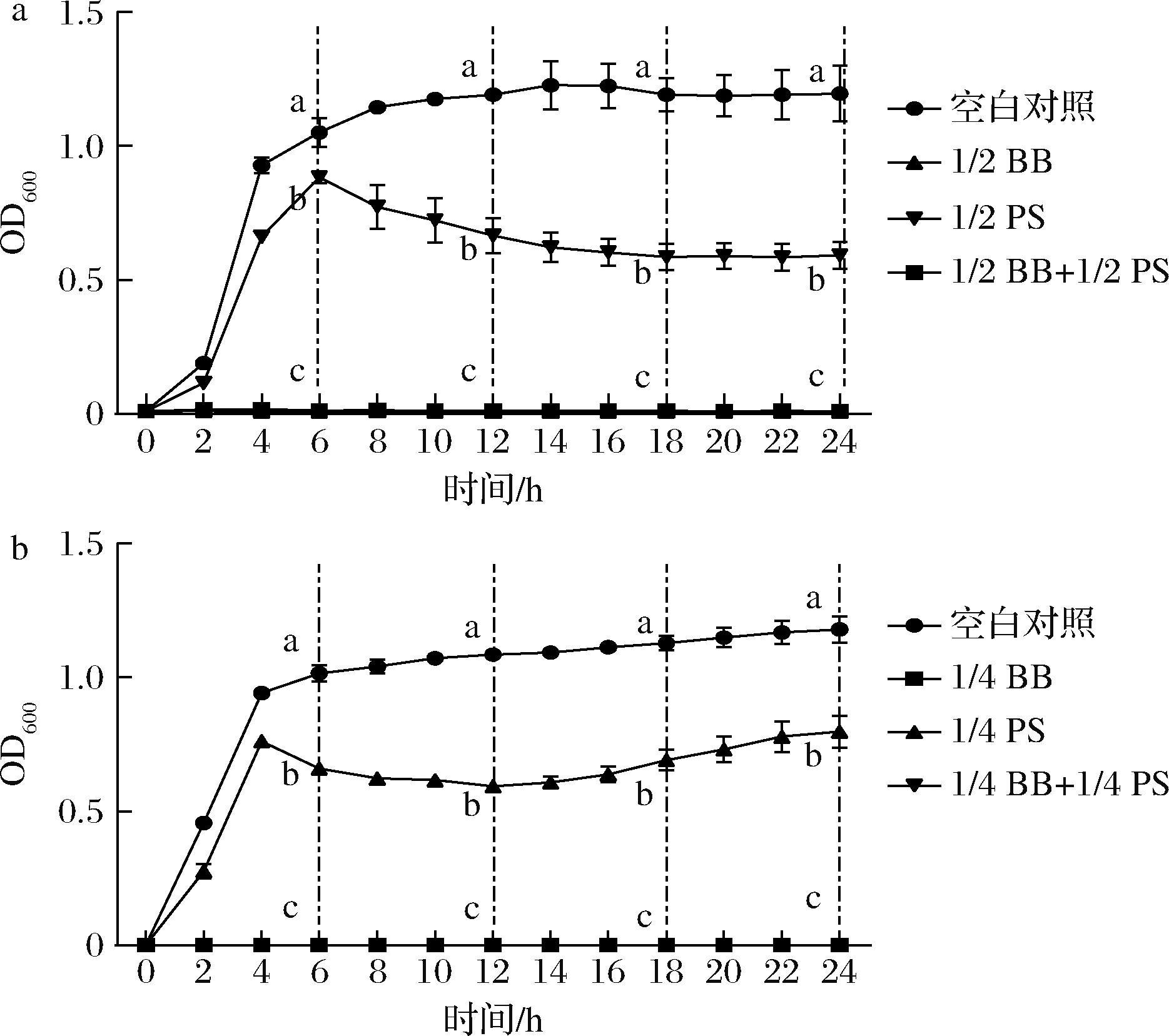 图2 PS和BB单独使用或联用对S.aureus生长的影响