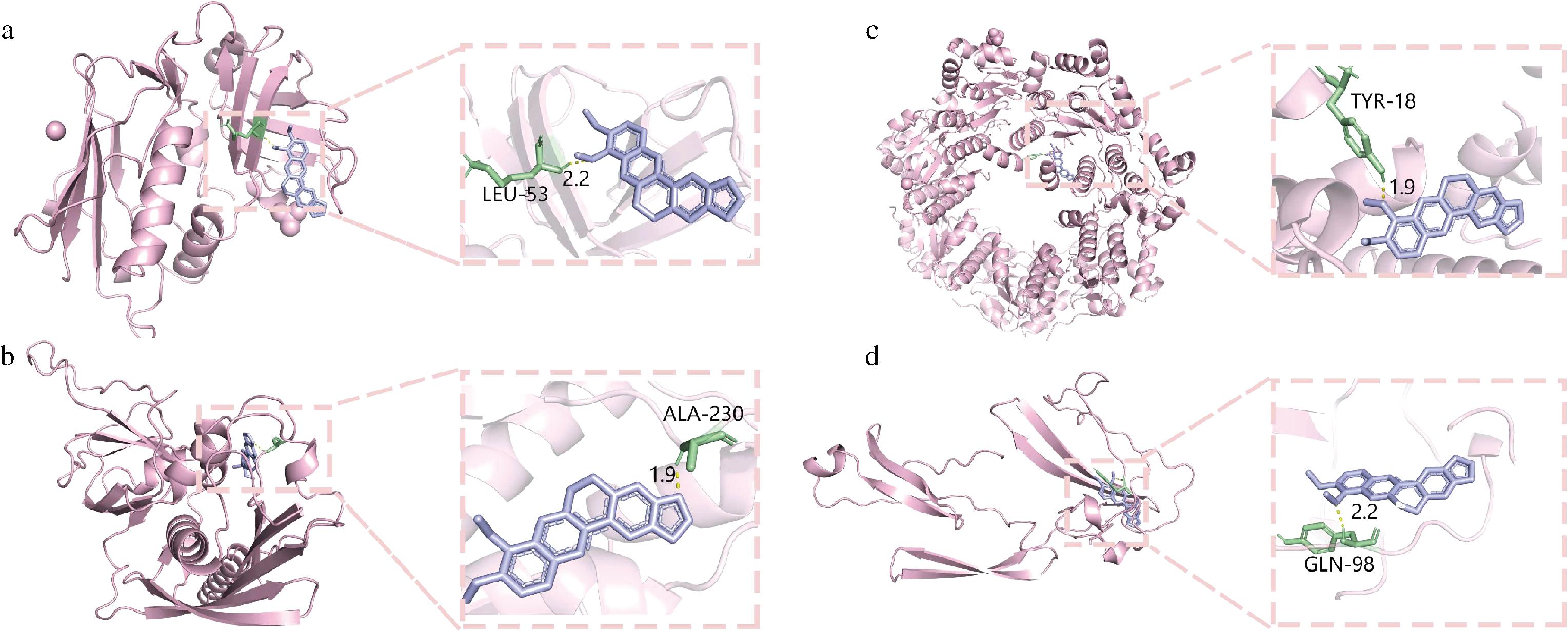 天然化合物能直接作用于S.aureus的毒力蛋白,减缓其毒副作用[12]。为了检验小檗碱是否会影响S.aureus毒力因子,选取了肠毒素A、肠毒素B、ClpP和ClfA为受体蛋白。利用分子对接的方法,探究小檗碱和S.aureus毒力因子之间的作用力。结果如图4所示。