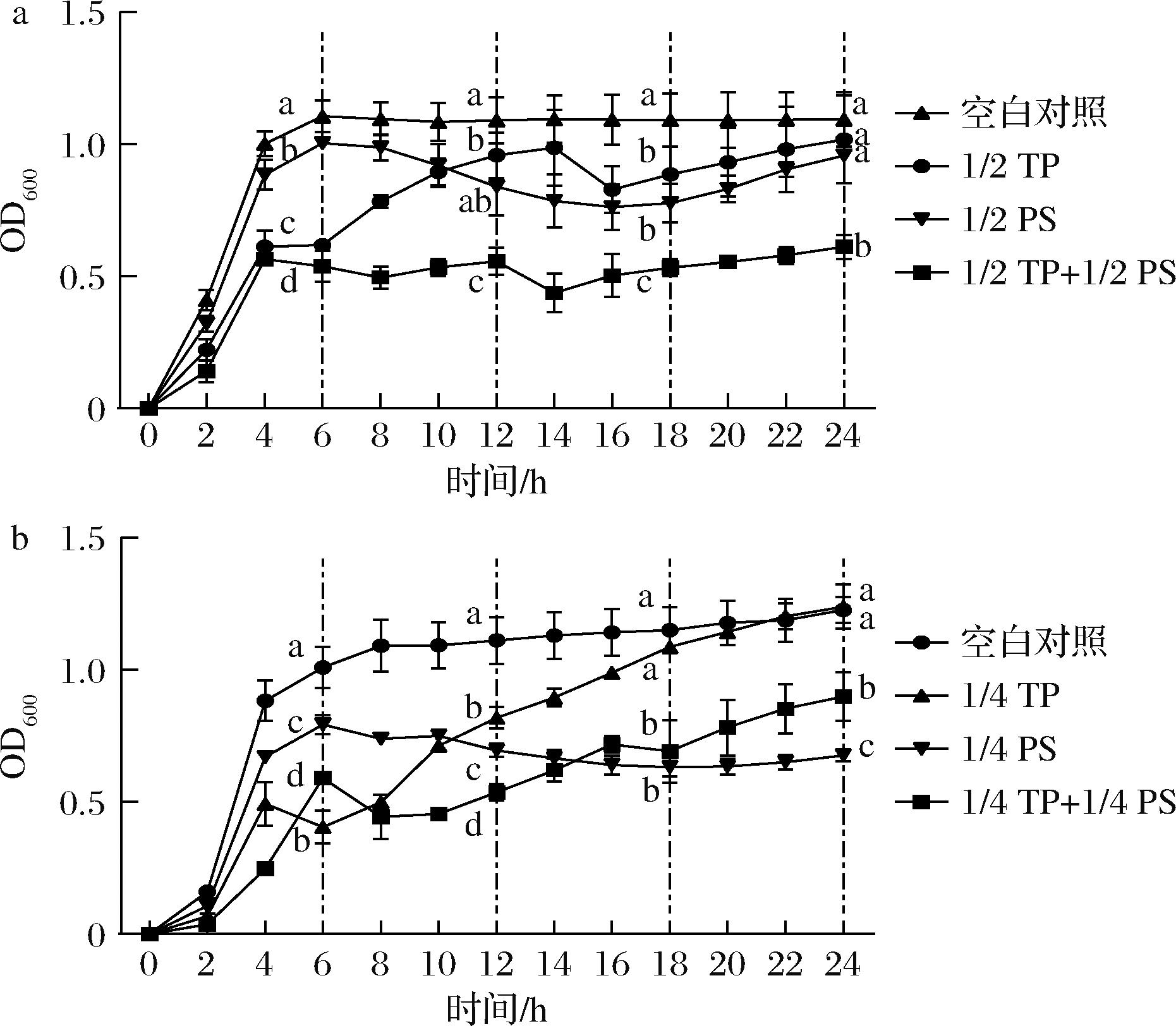 图1 PS和TP单独使用或联用对S.aureus生长的影响