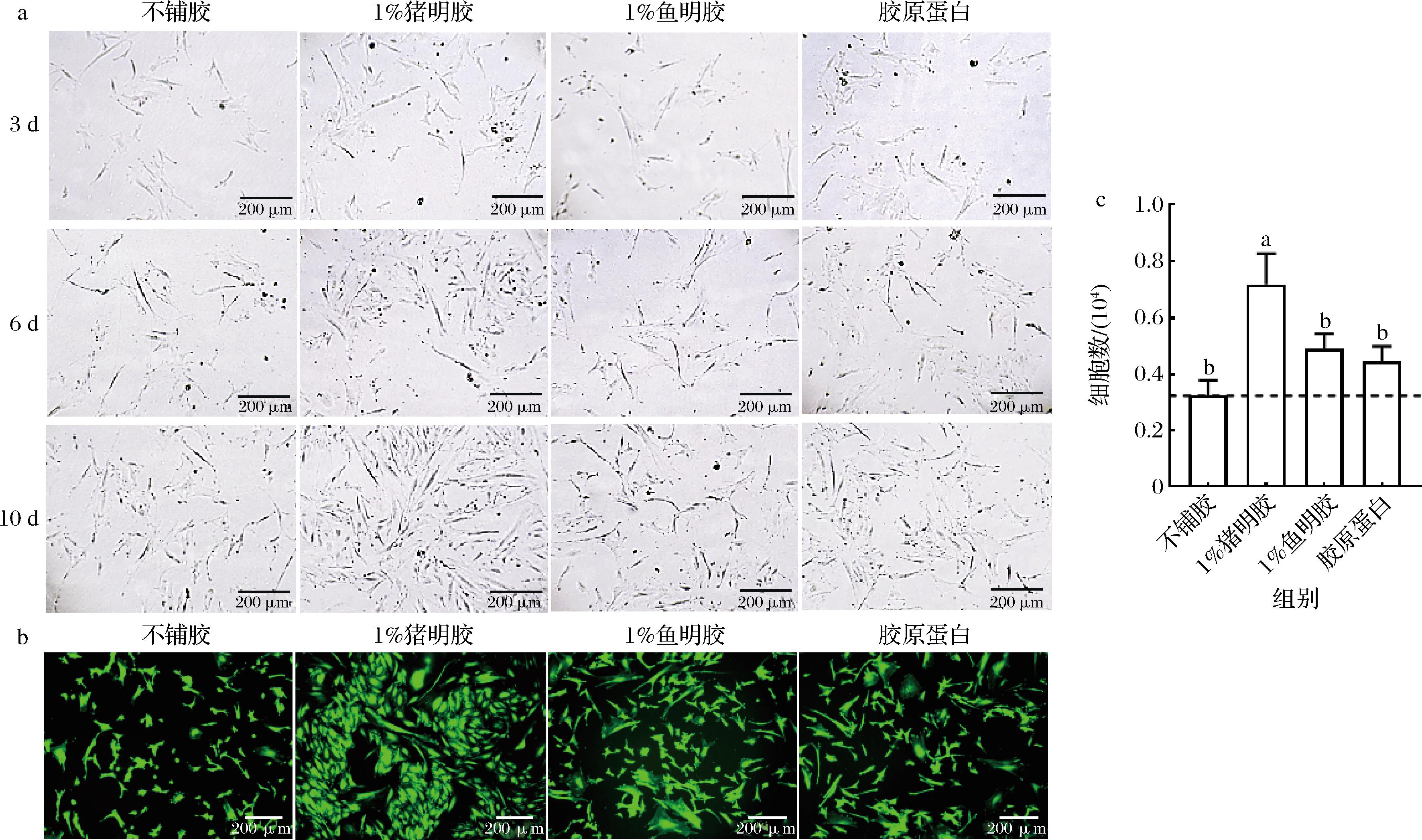 a-增殖情况的细胞显微形态;b-培养10 d后的活细胞染色;c-培养10 d后的细胞数